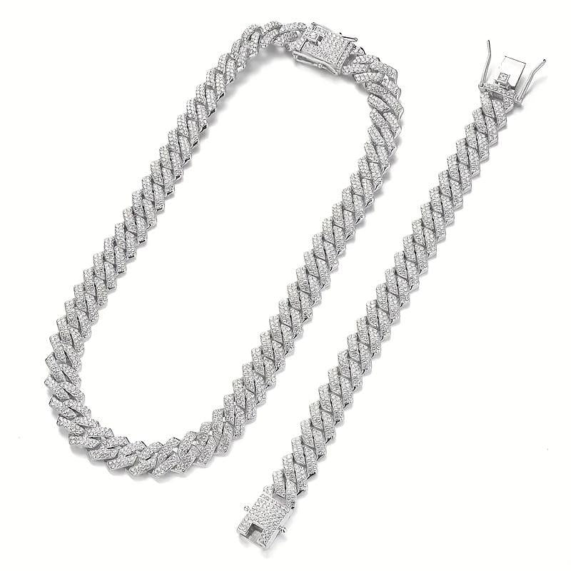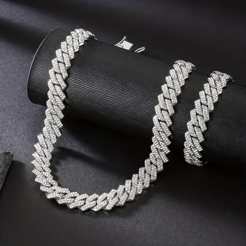 This stylish set features a zinc alloy chain necklace and bracelet with rhinestone mosaic for a trendy and eye-catching look. Perfect gift for those who love personality-style jewelry.