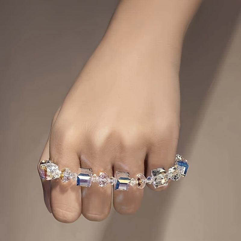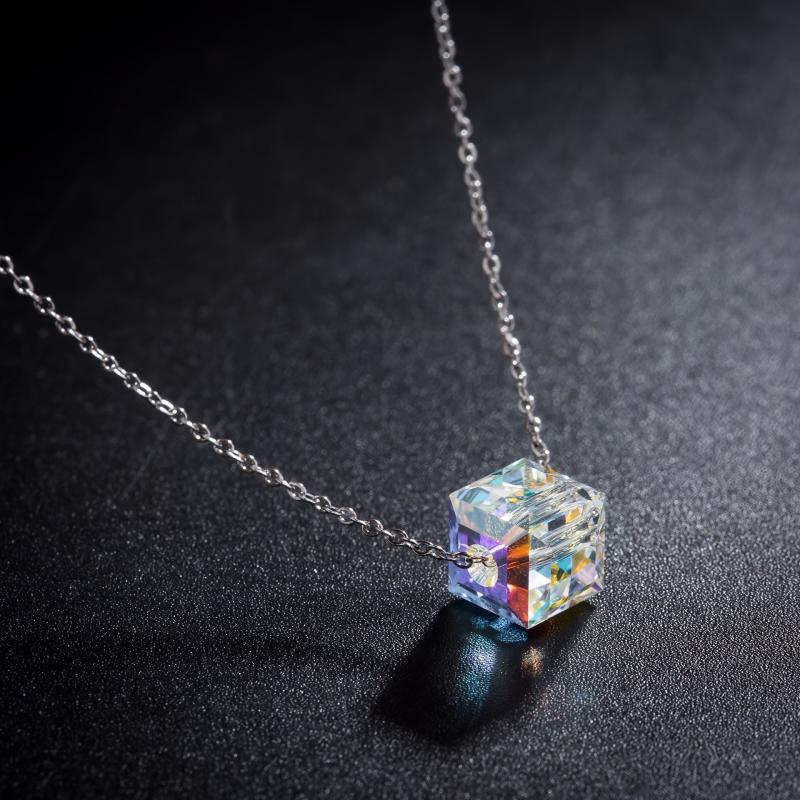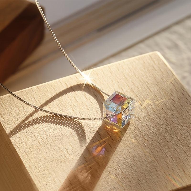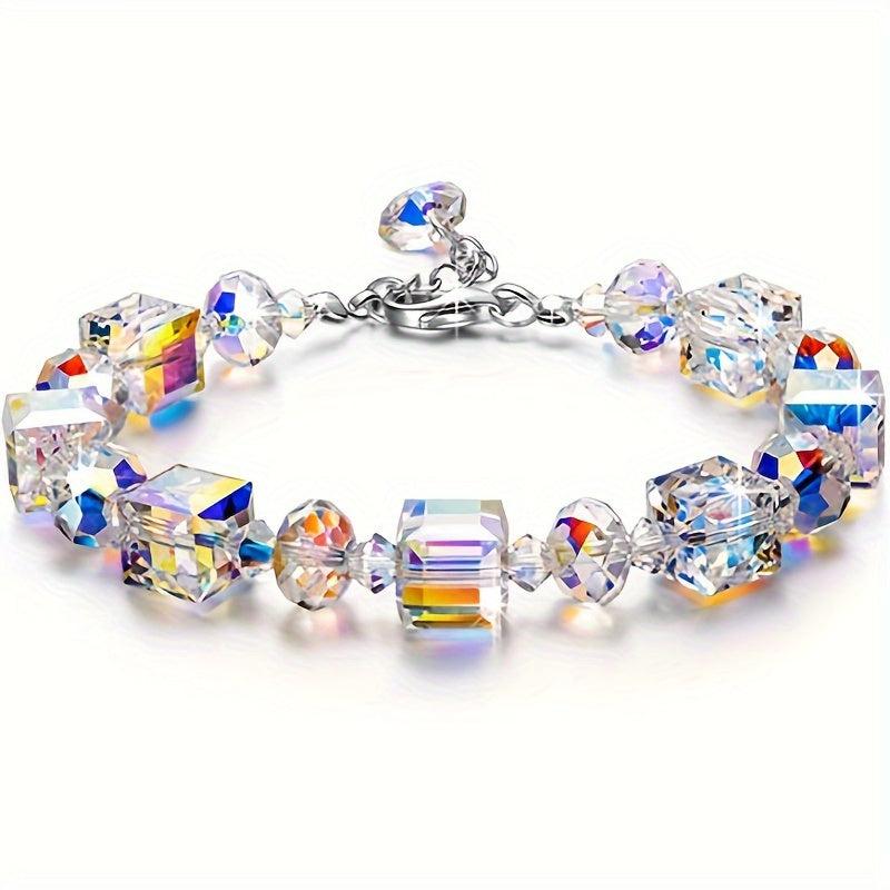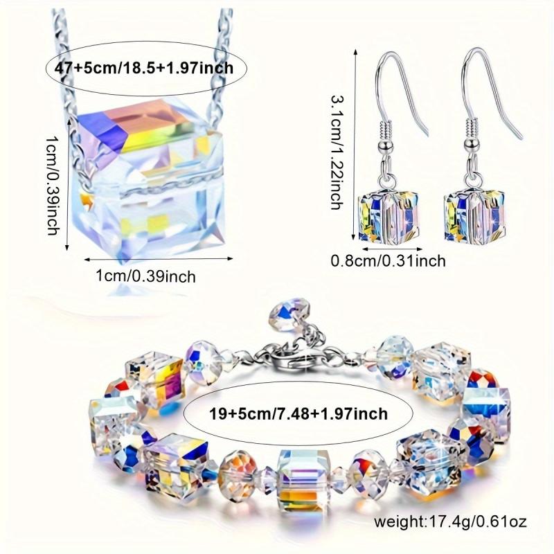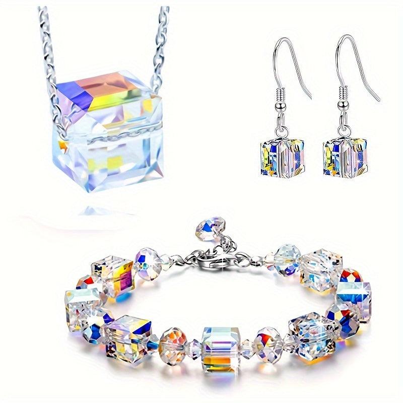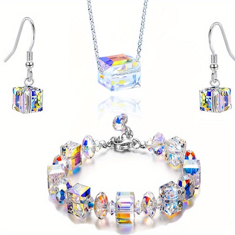 Embrace the bling bling style with this stunning jewelry set featuring iridescent gradient glass cubes. The set includes earrings, a bracelet, and a necklace.