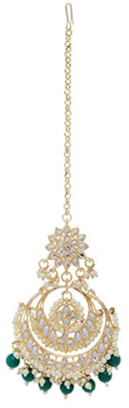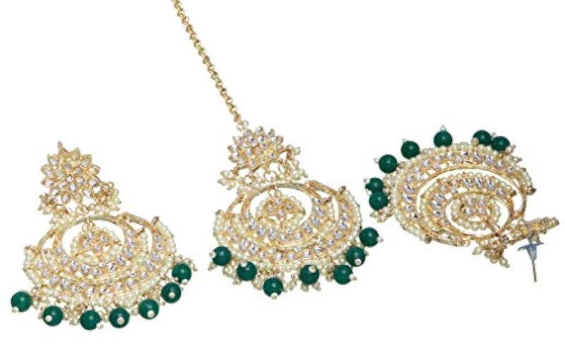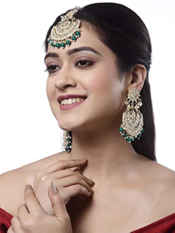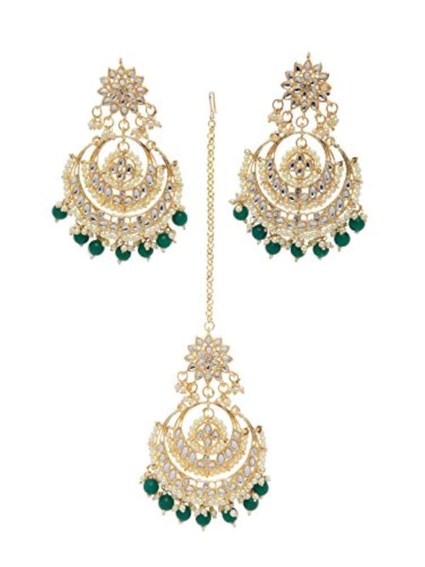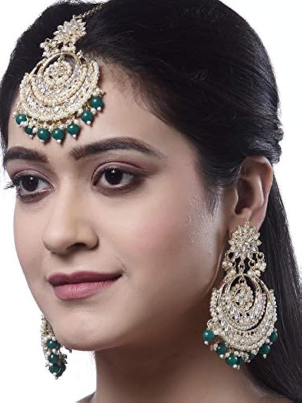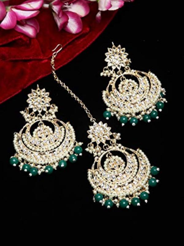 Elegant set featuring traditional Kundan maang tikka and earrings.