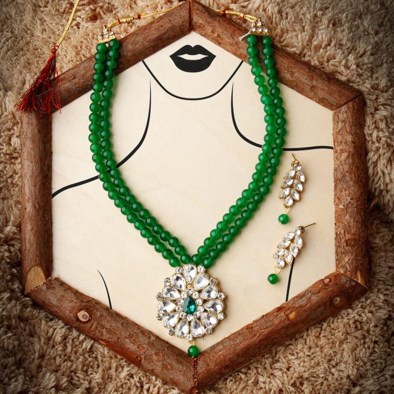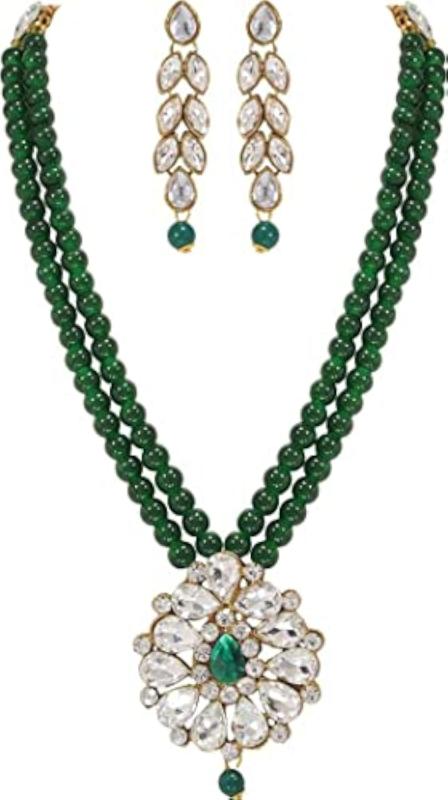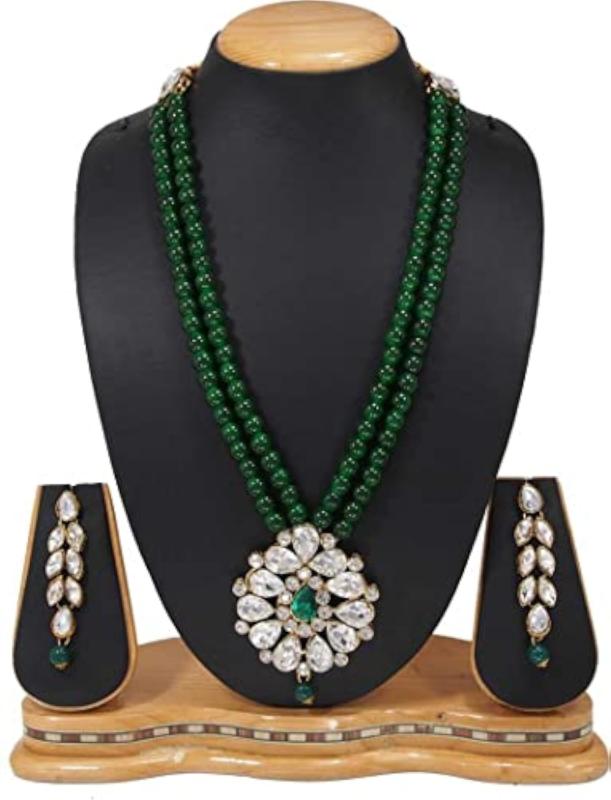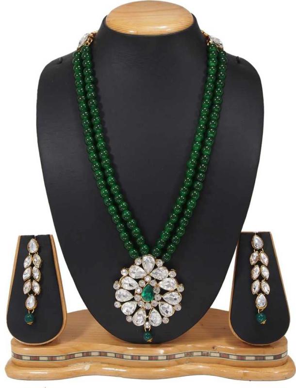 Elegant Kundan and pearl studded long necklace set in toned finish.