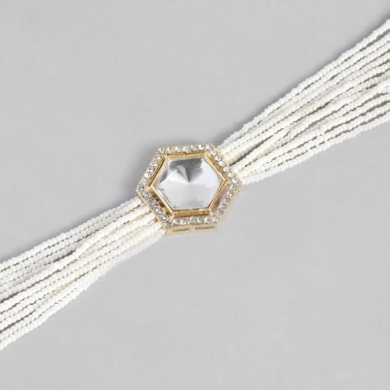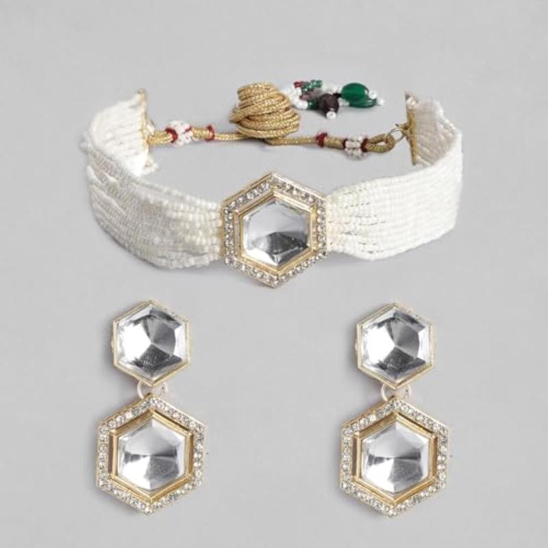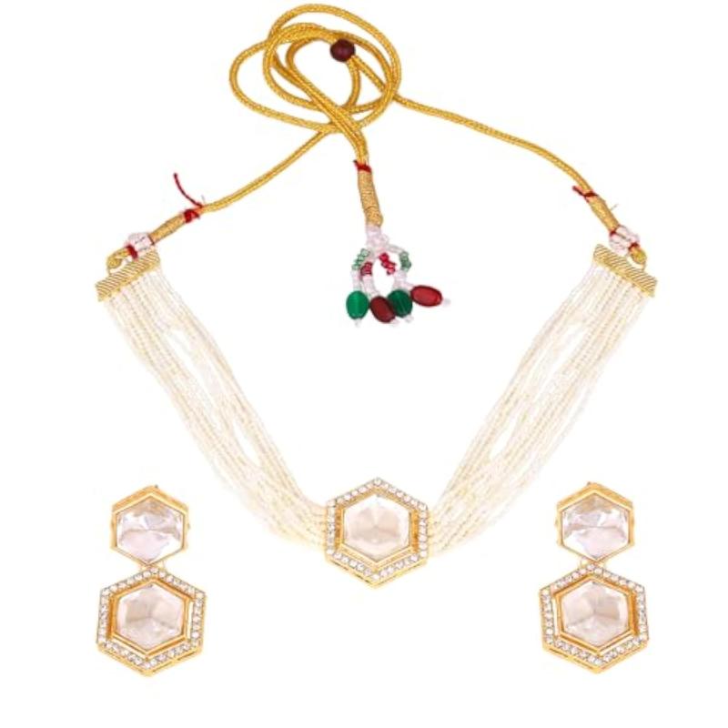 Elegantly designed choker necklace set featuring intricate Kundan Polki work with lustrous pearls. Perfect for special occasions.