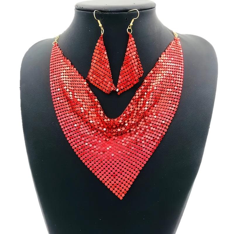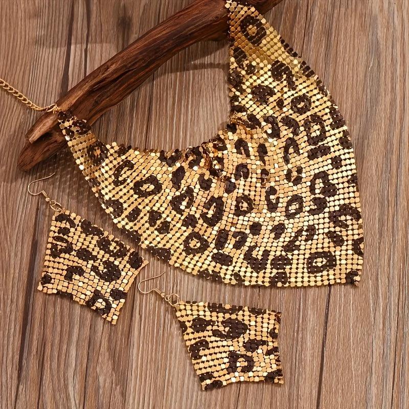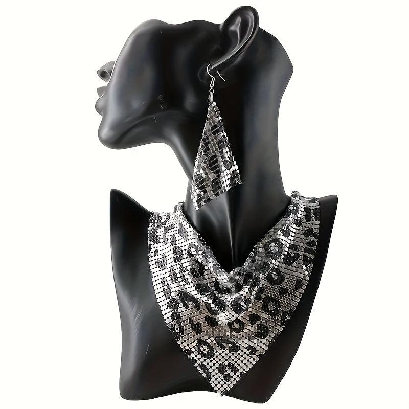 Add a touch of retro glamour with this sequinned silky scarf featuring a false collar and leopard print design. Complete your look with the collarbone necklace and earrings set.
