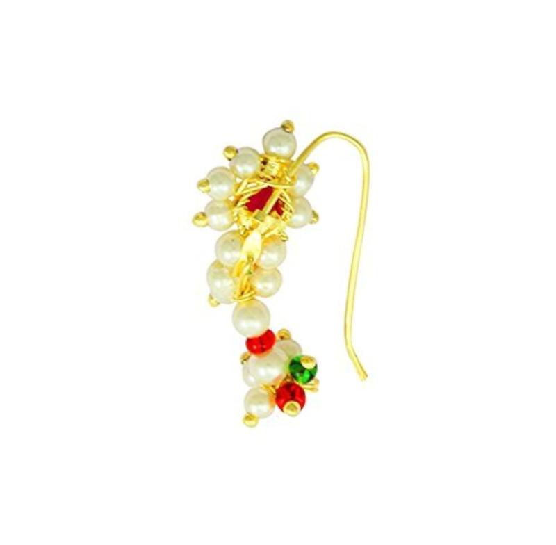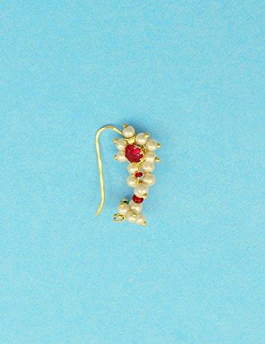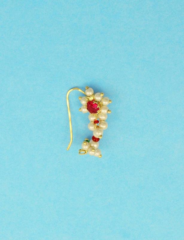 Elegant Maharashtrian nath nose ring featuring a pink coloured stone plated with pearl beads. Perfect traditional accessory.