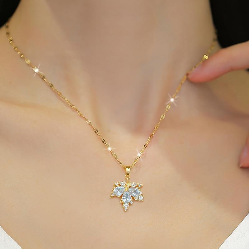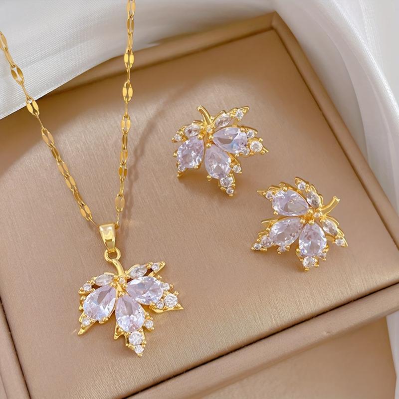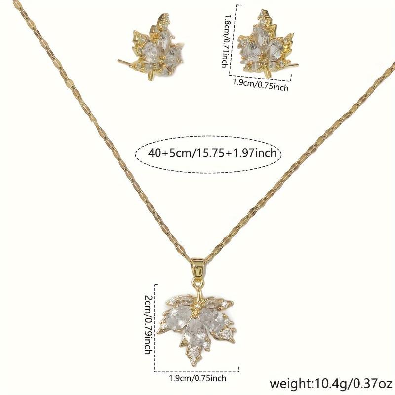 This exquisite jewelry set includes a pair of stud earrings and a necklace featuring a golden maple leaf design. The set is crafted from copper and adorned with sparkling zirconia, perfect for a vintage style look.