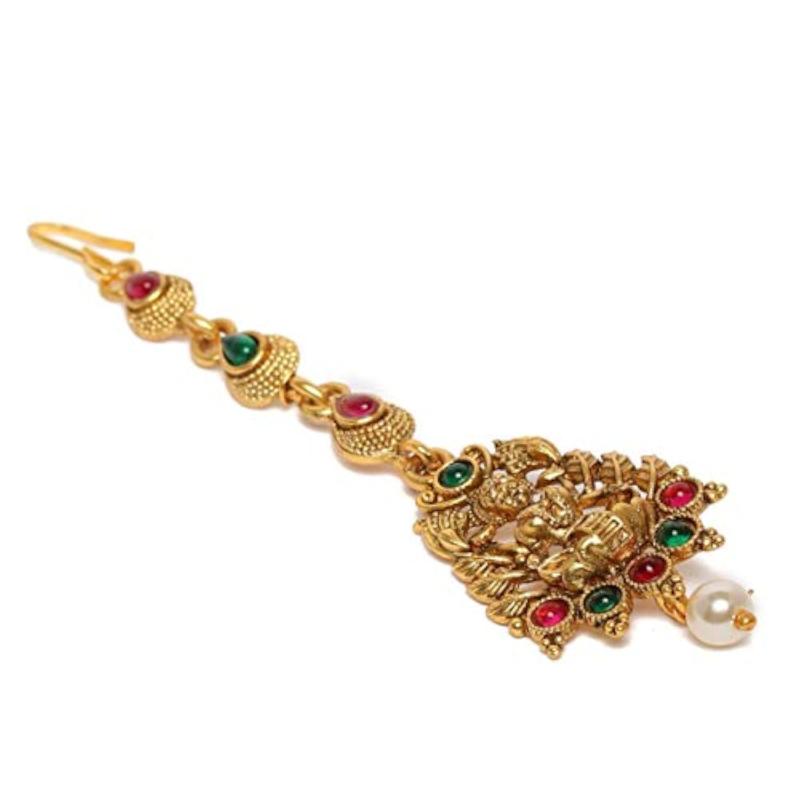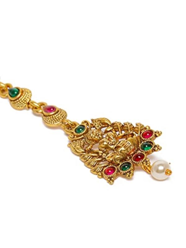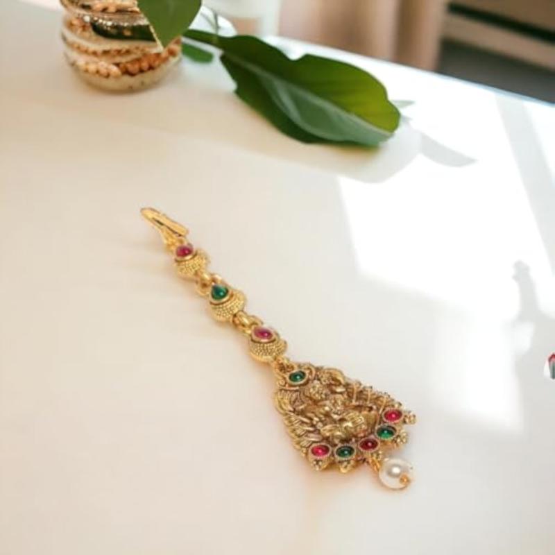 Elegant maang tikka inspired by temple jewellery, featuring Laksmi Mata design with ruby and emerald embellishments.