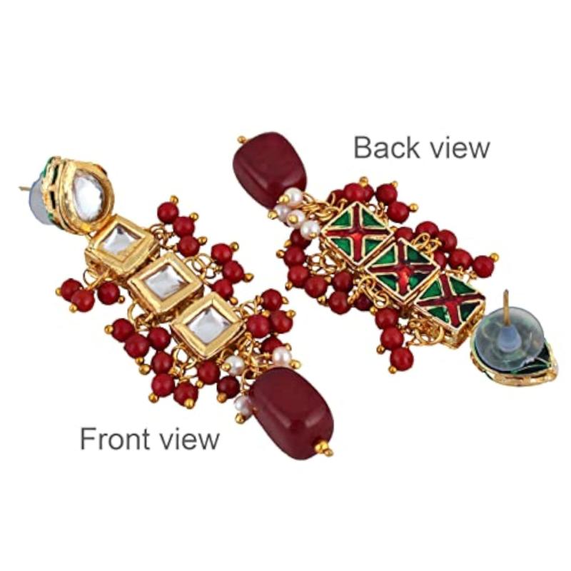 Elegant set featuring uncut Kundan Big Faux Dibbi choker necklace and square shape tika earrings. Plated with 18k Meenakari for a luxurious look.