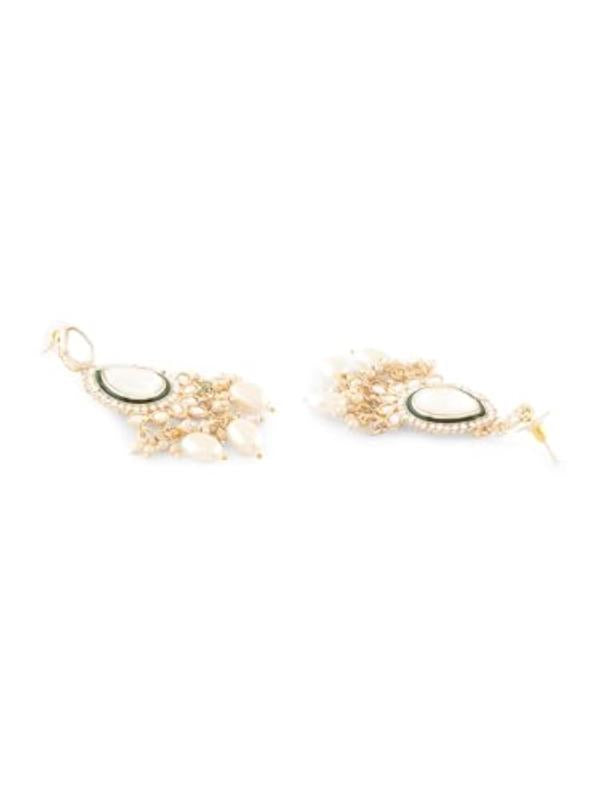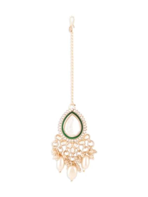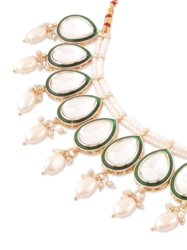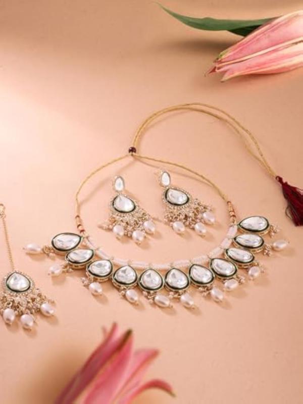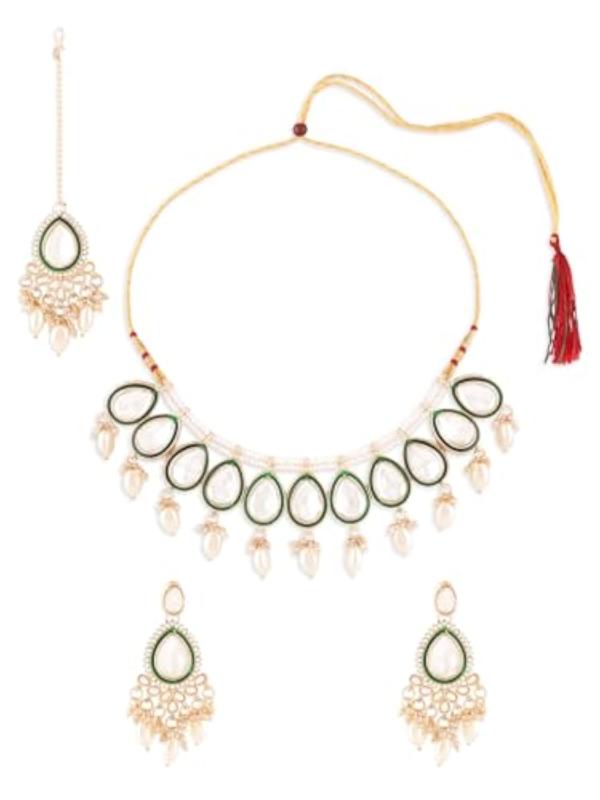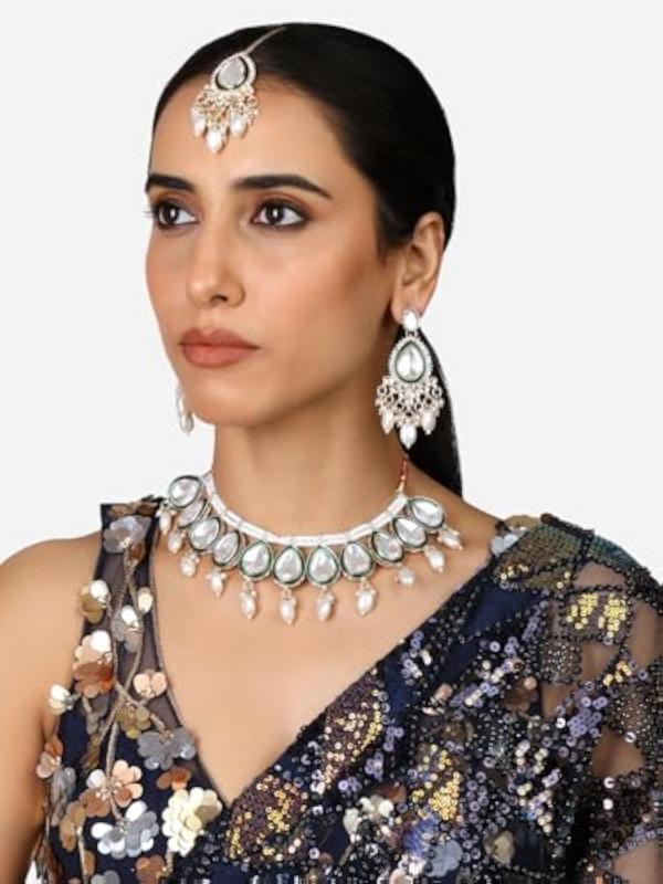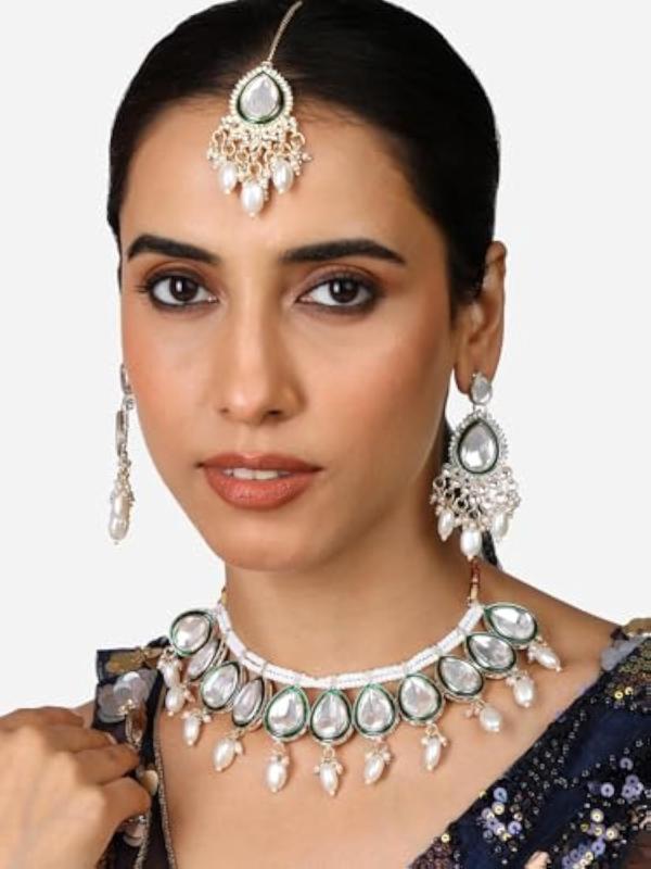 This elegant set features a choker necklace, earrings, and maangtikka with intricate Meenakari and Kundan work.