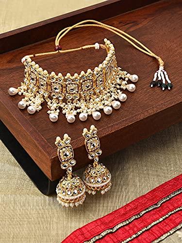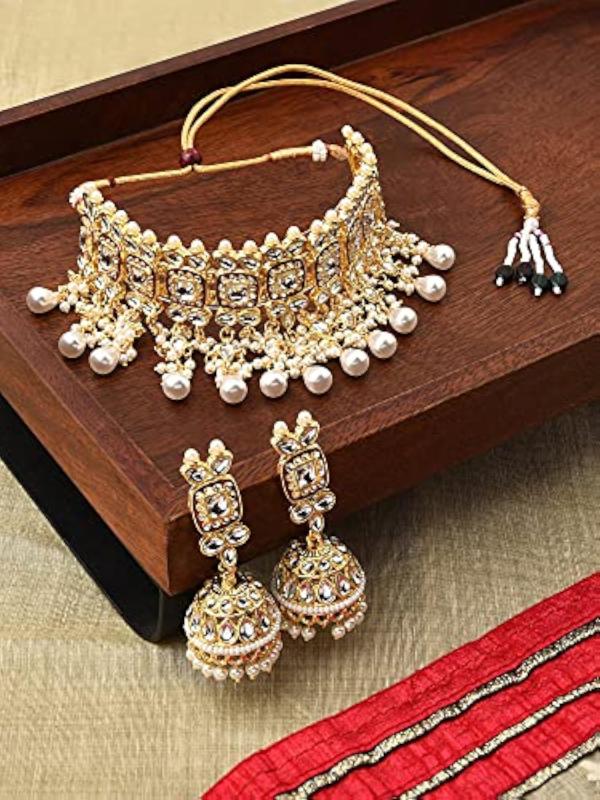 Exquisite Meenakari Kundan choker necklace and jhumki earring set for women.
