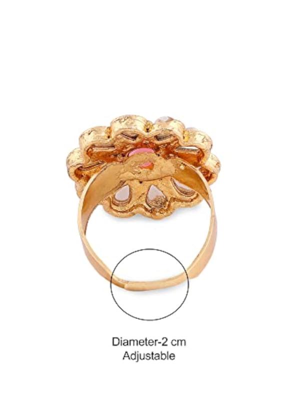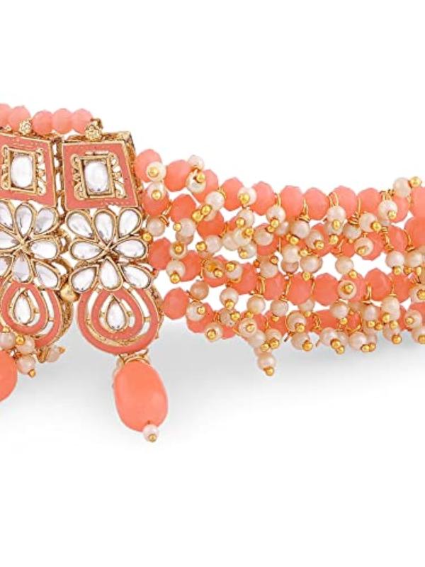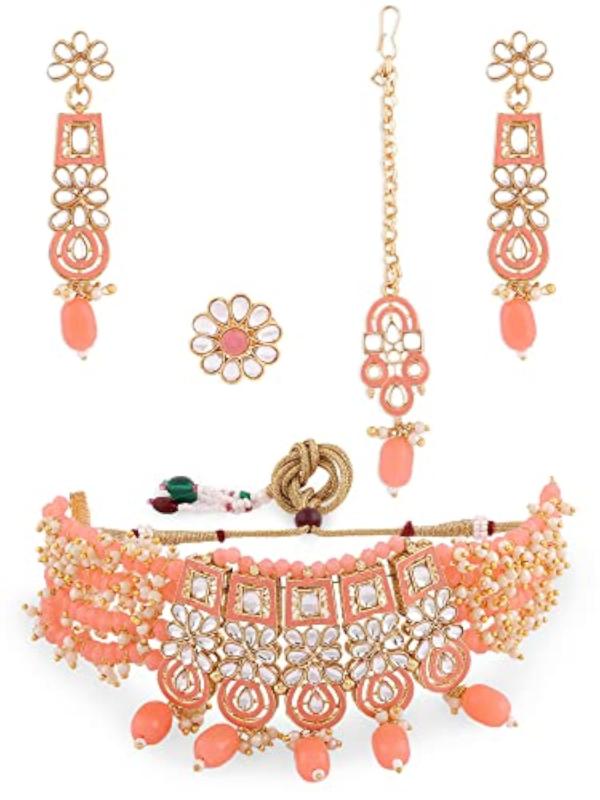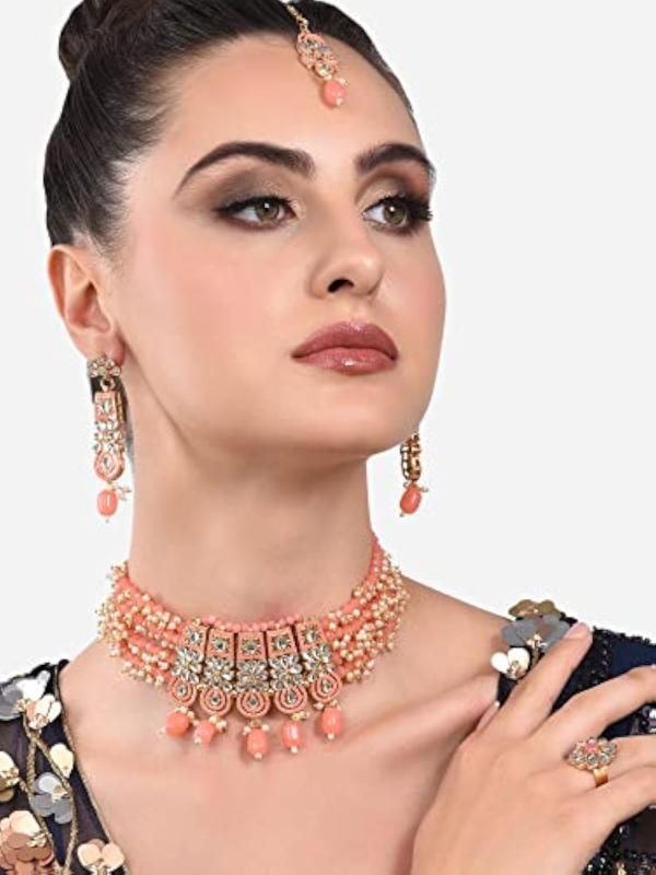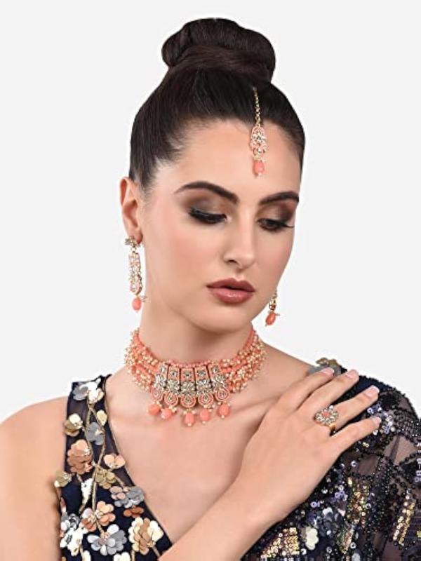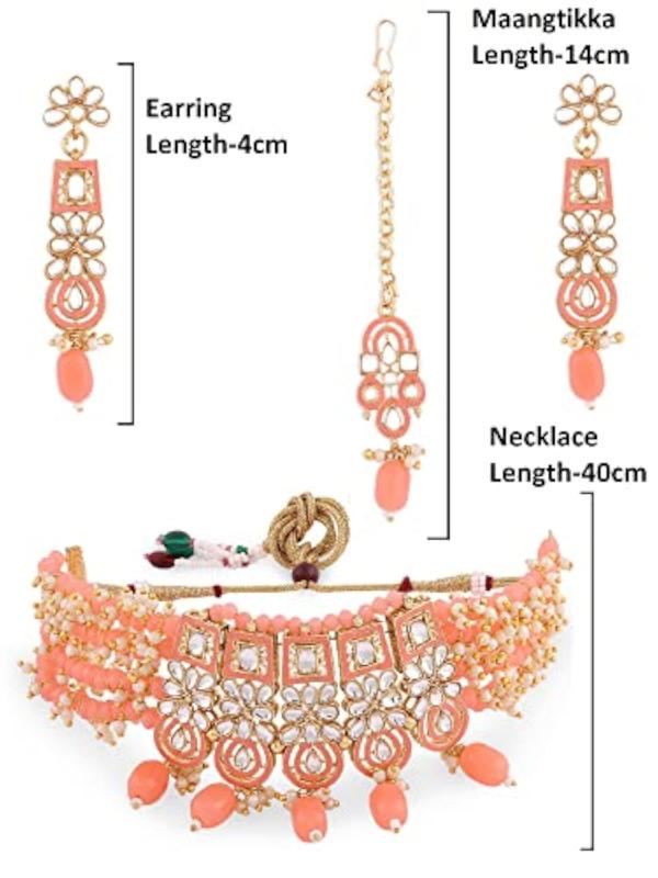 This exquisite jewelry set features a multistrand cluster beaded necklace, matching earrings, a maangtikka, and a ring. The set is adorned with traditional Meenakari work and Kundan stones, making it a stunning choice for special occasions.
