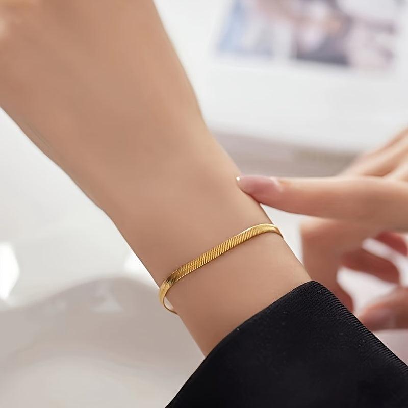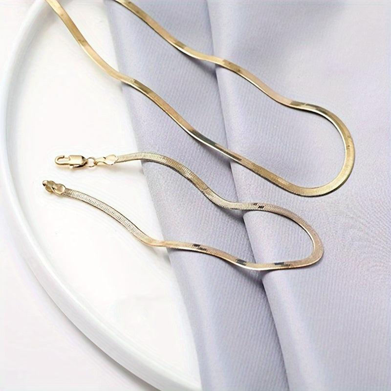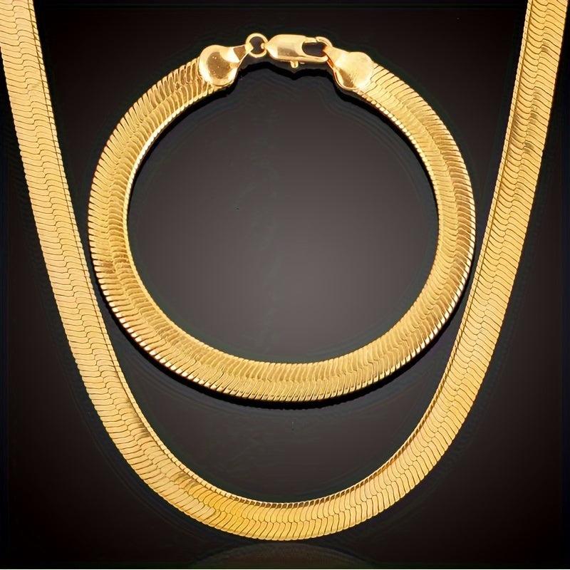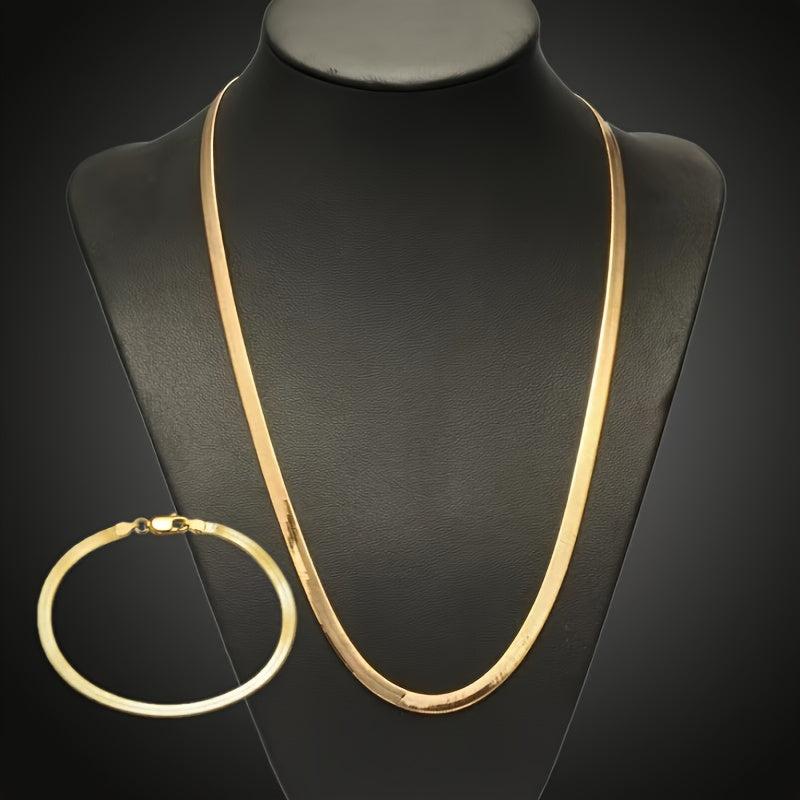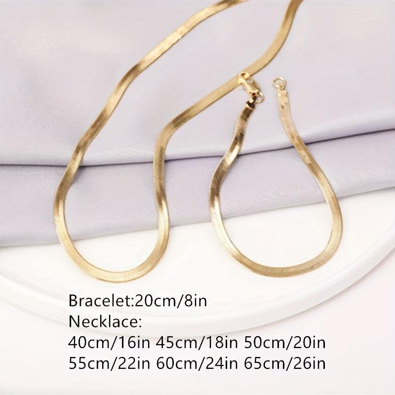 This stylish set includes a 4mm plated 18K golden flat snake bone chain bracelet and necklace that can be worn by both men and women. Add a touch of elegance to any outfit with this versatile jewelry set.