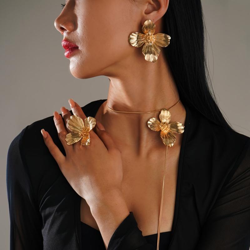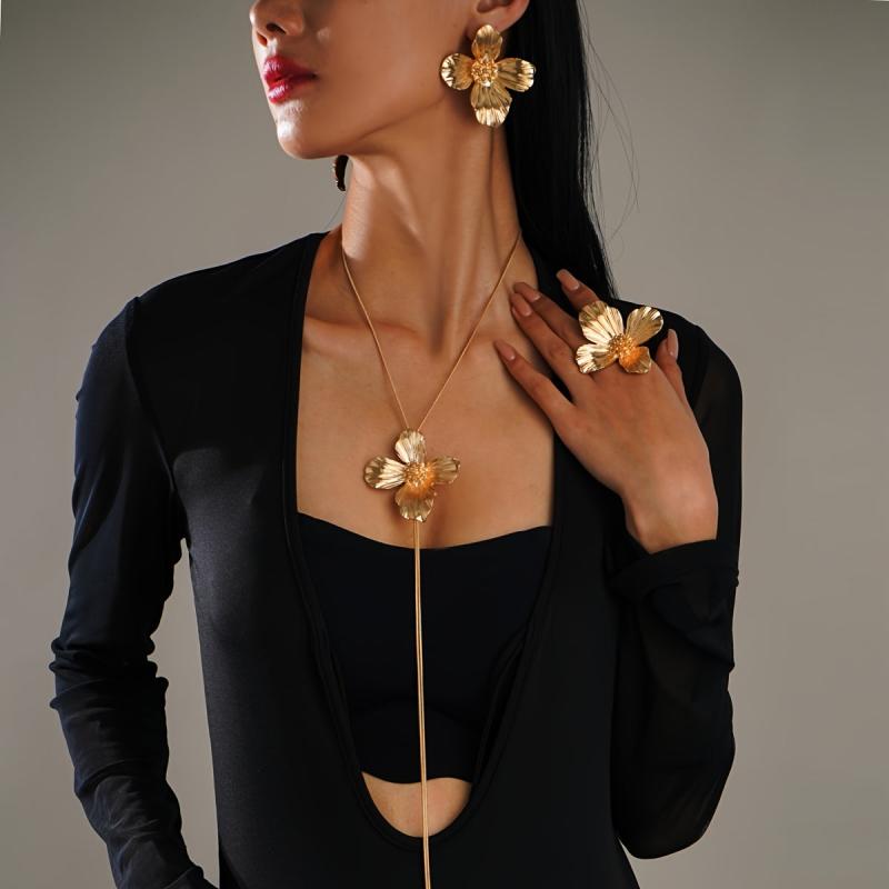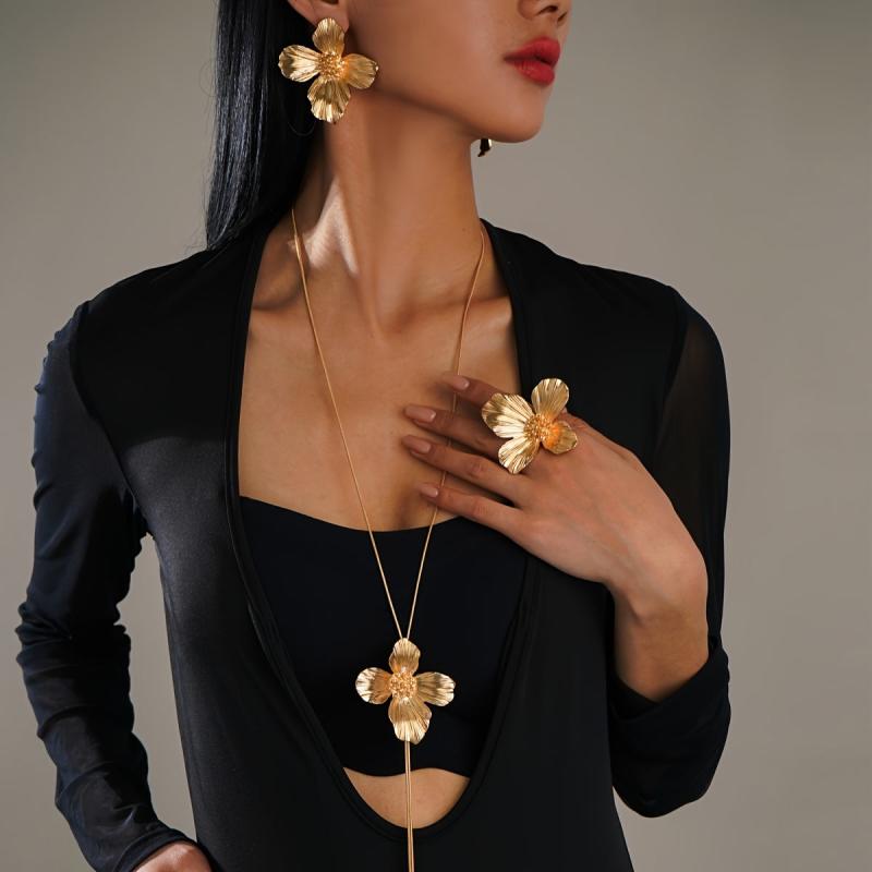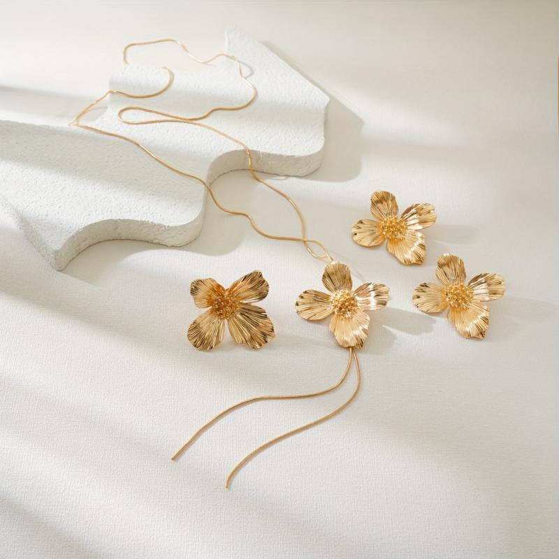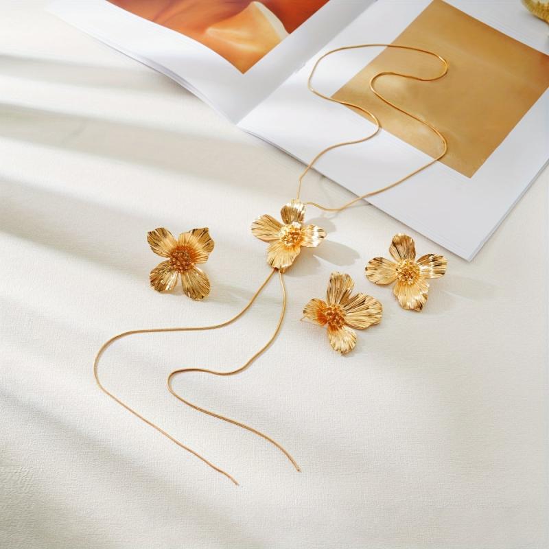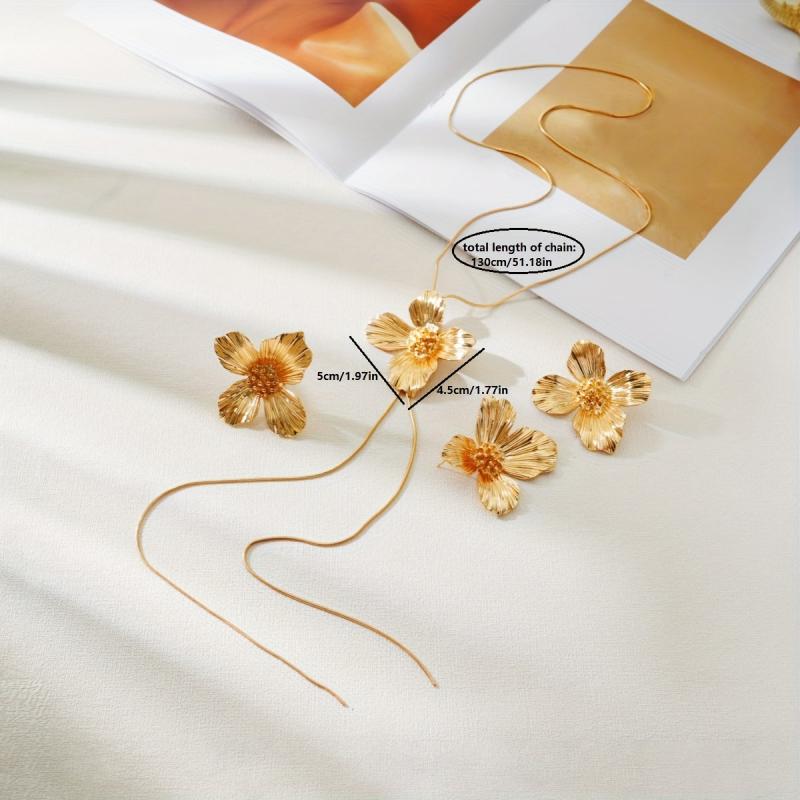 This two piece women's jewelry set features a metal flower pendant fine snake chain necklace, waist chain, and earrings and ring set. It offers a minimalist metallic style perfect for daily wear.