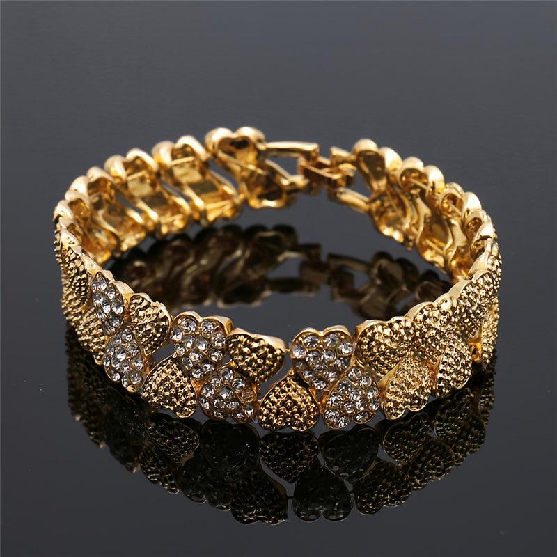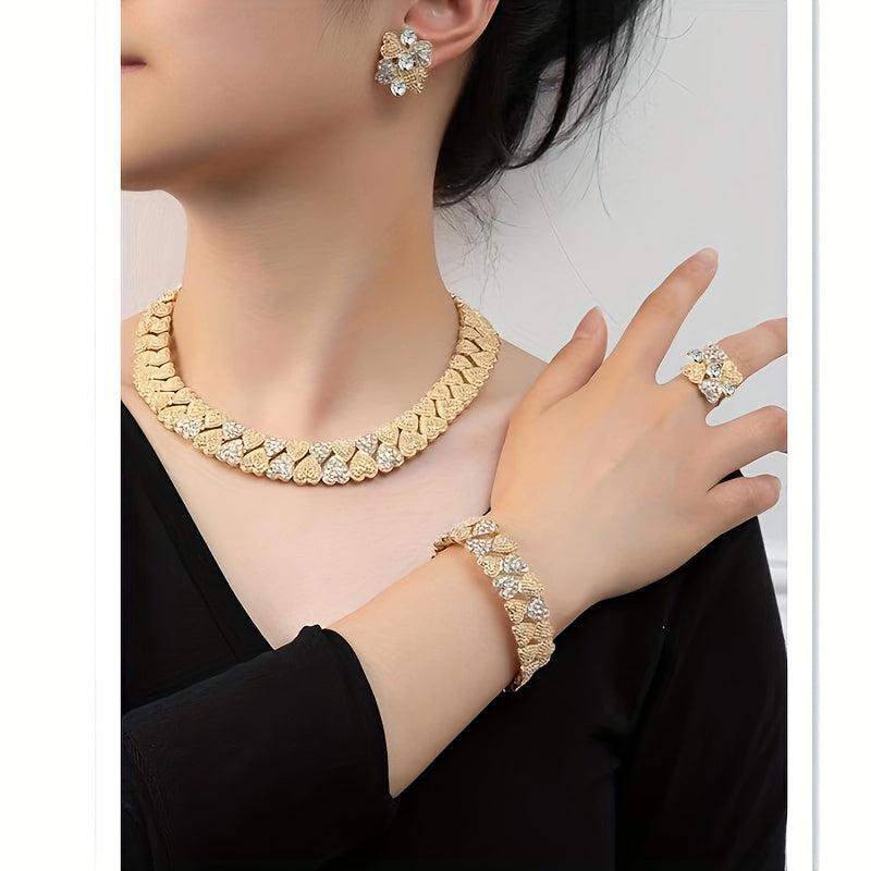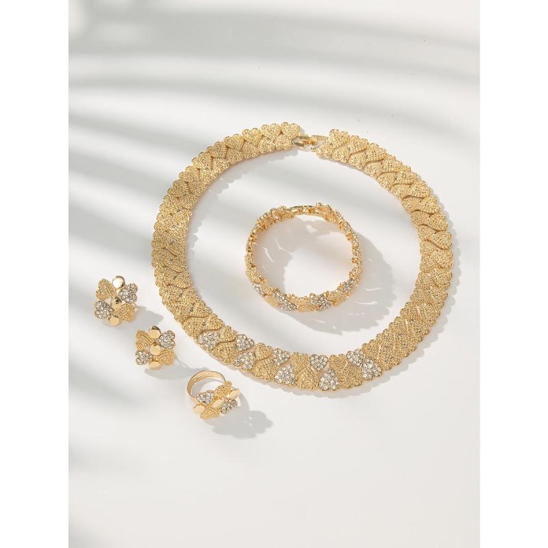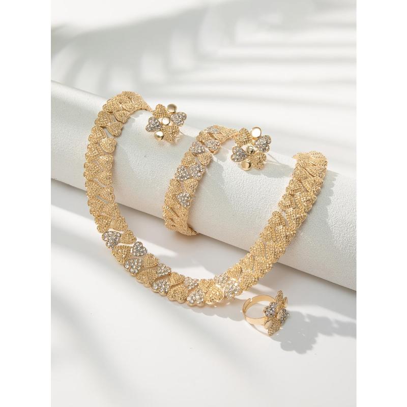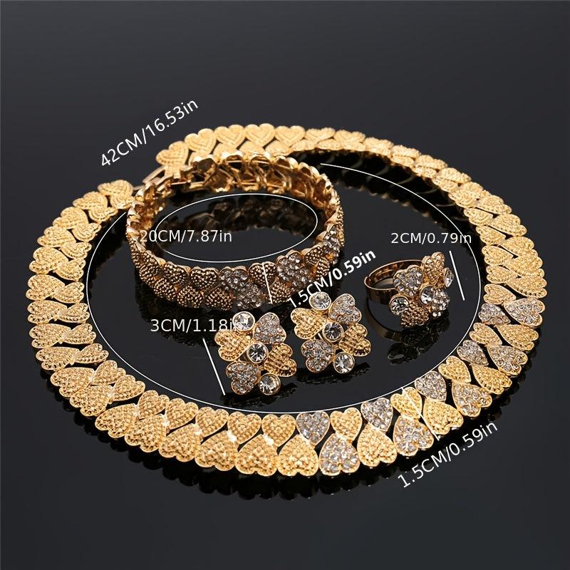 Complete your wedding look with this stunning set of Middle Eastern women's jewelry. Includes a necklace, earrings, ring, and bracelet to add elegance and beauty to any outfit.