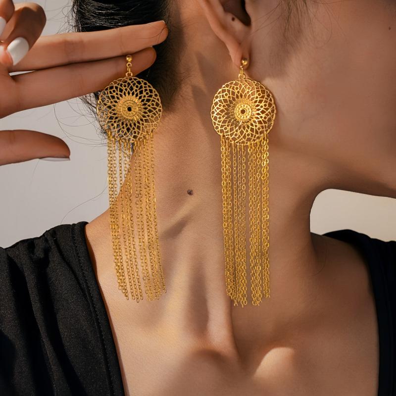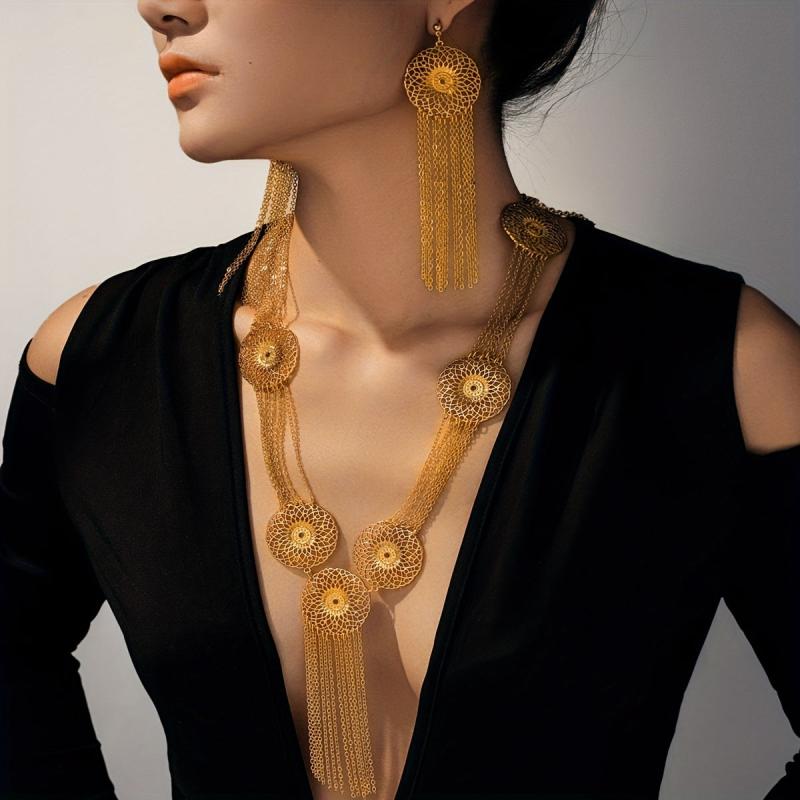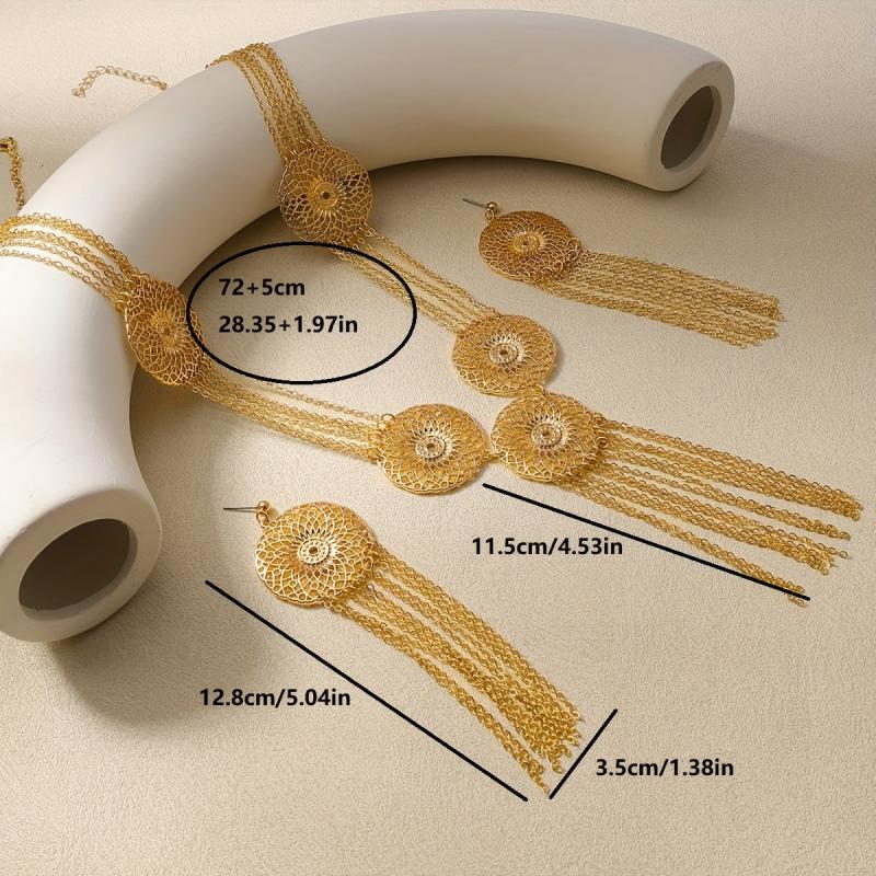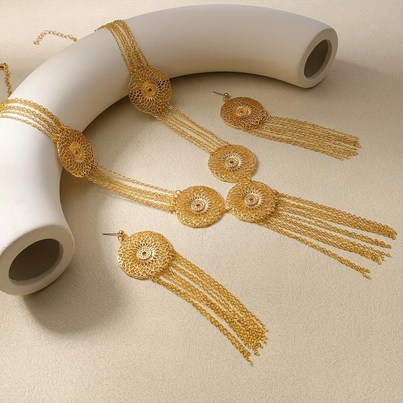 Elegant Middle Eastern inspired jewelry set featuring a geometric cutout round pendant with long tassels. Perfect for parties and events.