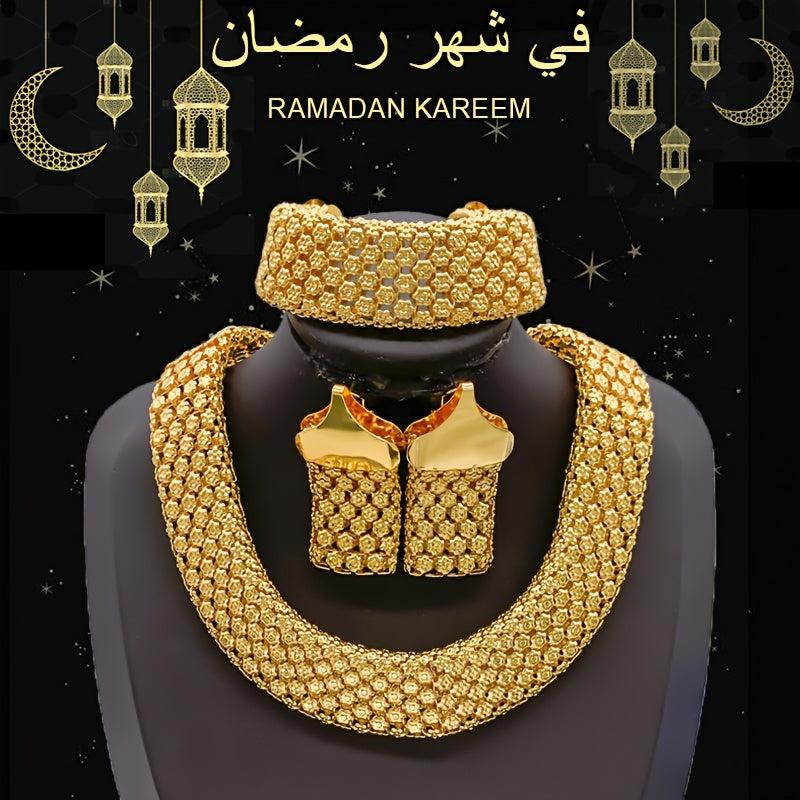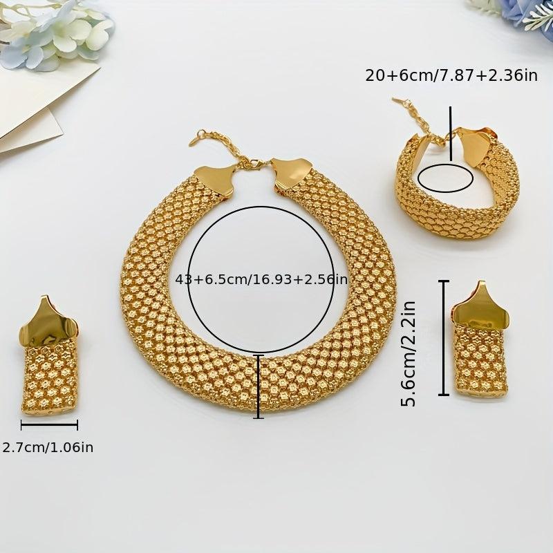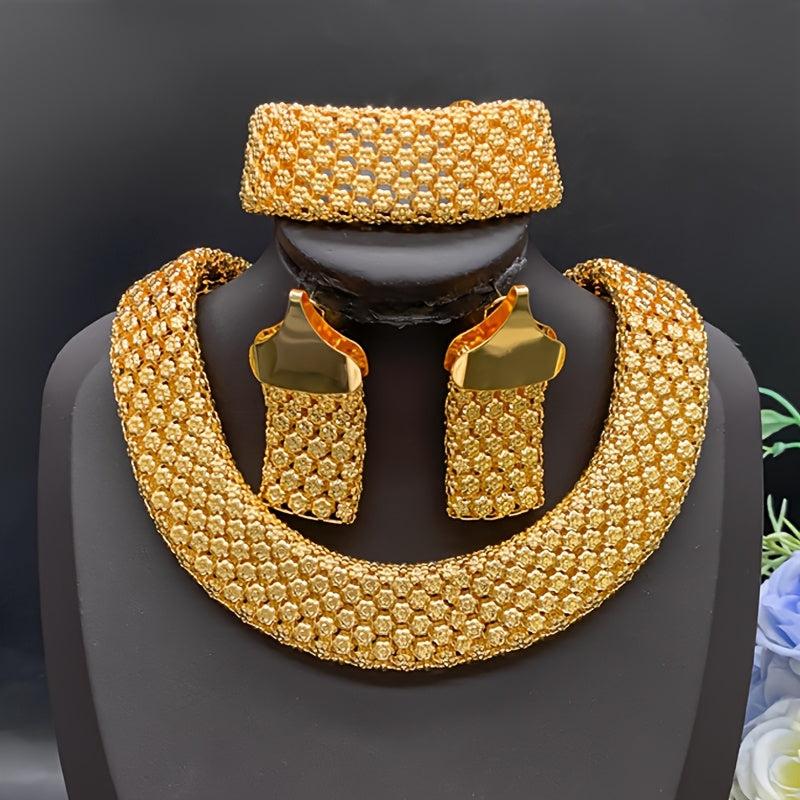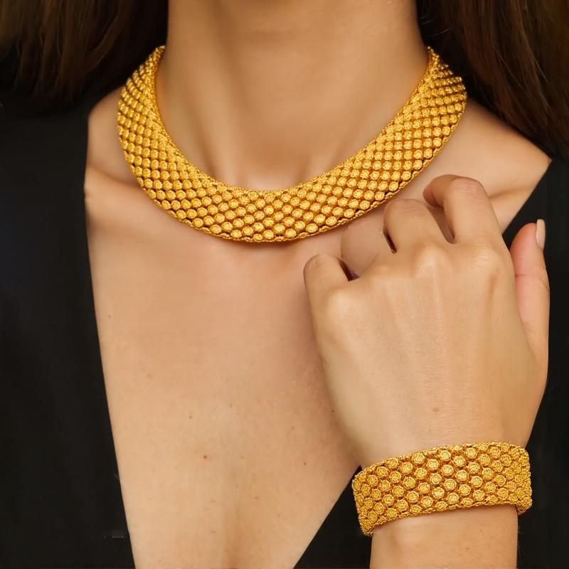 Elegant and minimalistic jewelry set inspired by Middle Eastern tribal style, ideal for Dubai bridal weddings. Set includes a necklace, earrings, and bracelet.