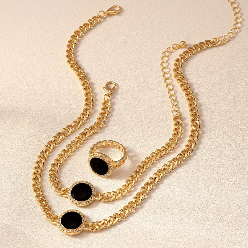 Elegant and minimalist three-piece jewelry set including a golden necklace, ring, and bracelet, perfect for everyday wear or special occasions.