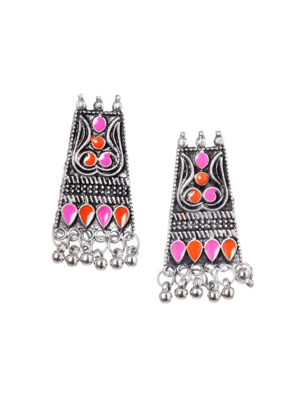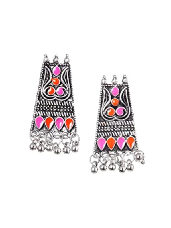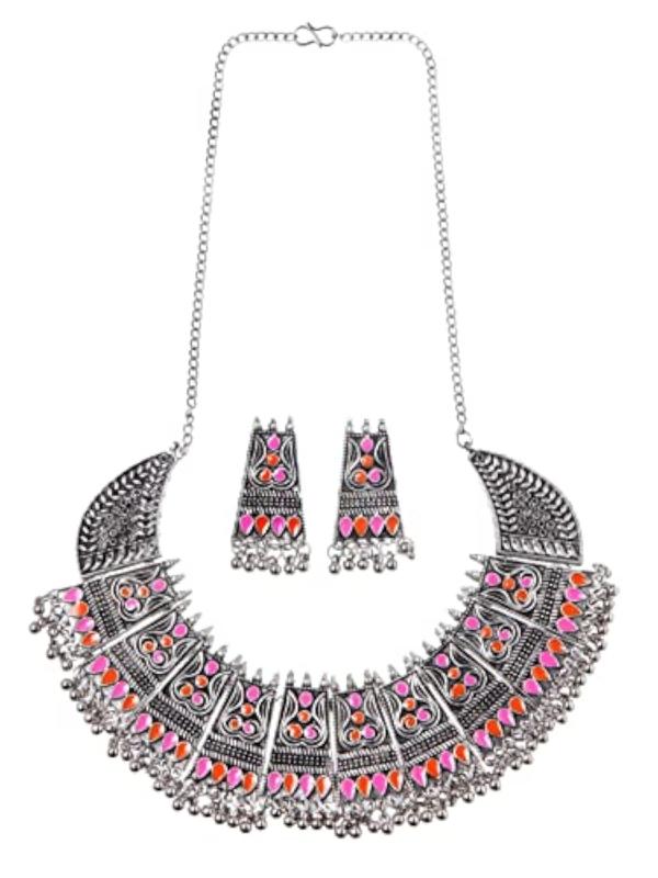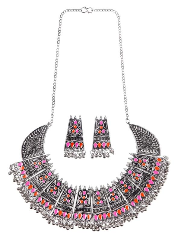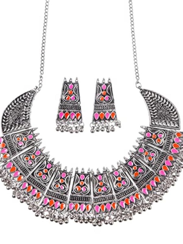 Elegant jewelry set featuring oxidised silver-plated pieces with intricate details.