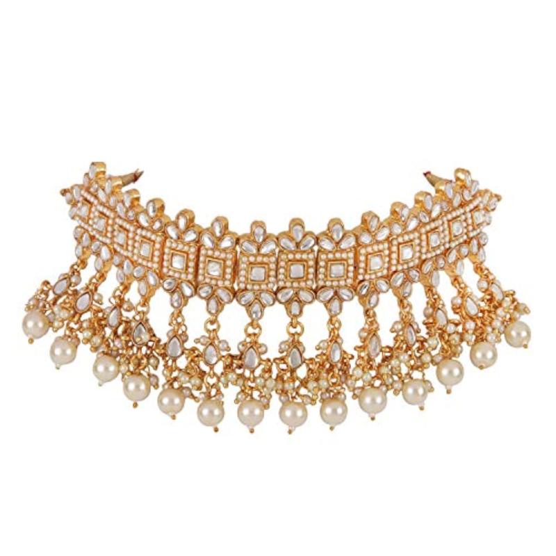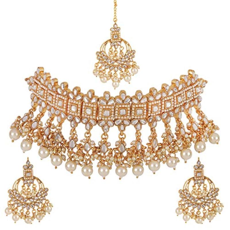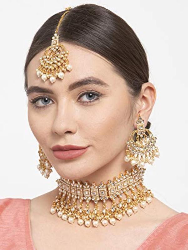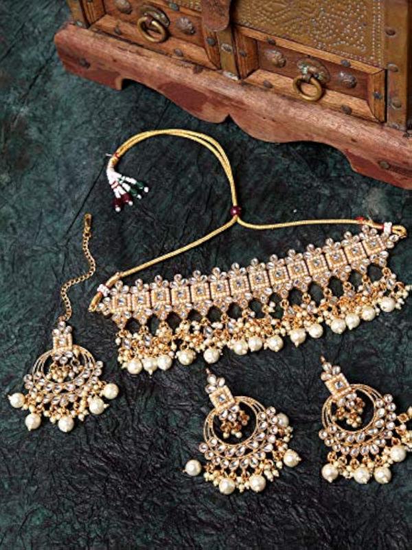 Stunning choker necklace set featuring traditional pearl and Kundan design. Perfect for special occasions.