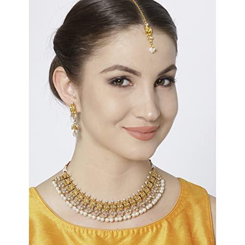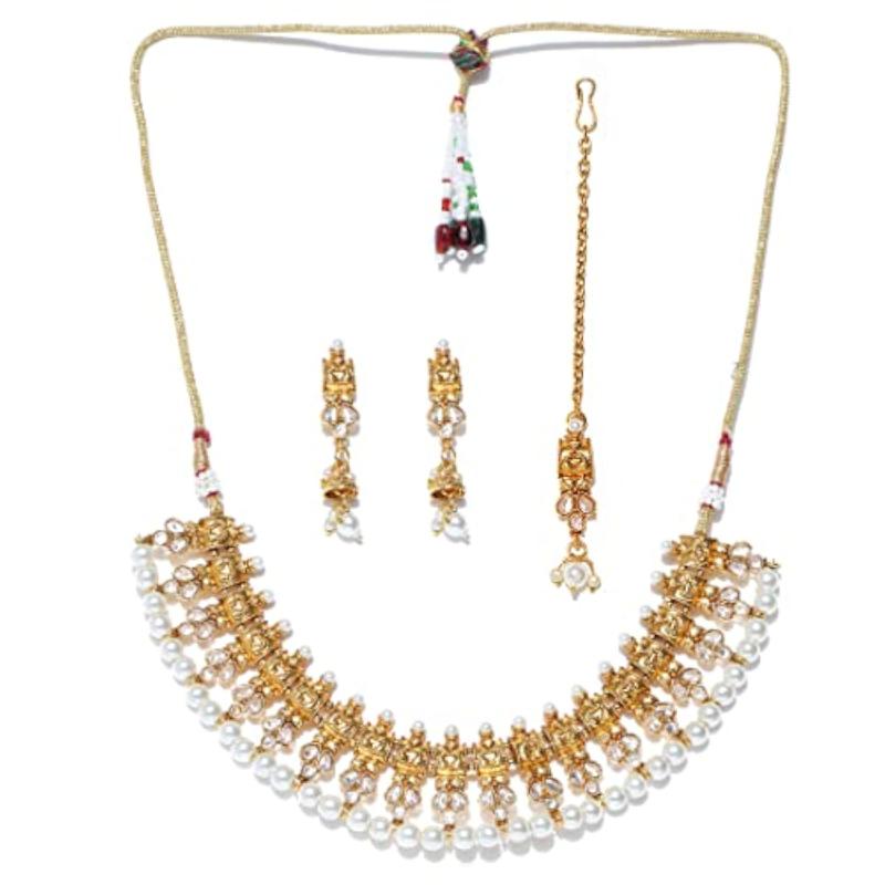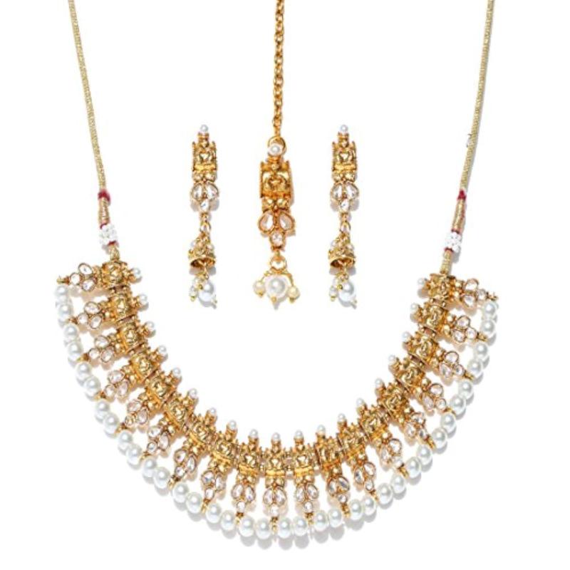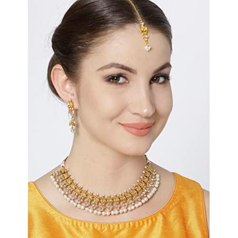 Elegant traditional necklace set with maang-tika adorned with delicate pearls and kundan stones.