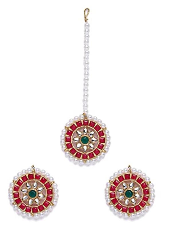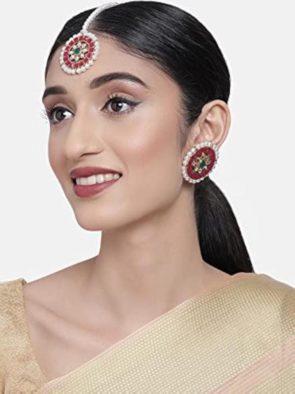 Elegant earring and maangtikka set with pink and green stones. Perfect for weddings and special occasions.