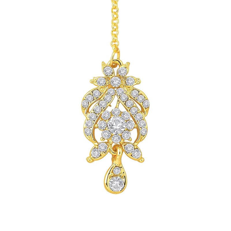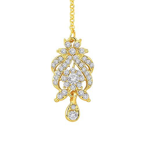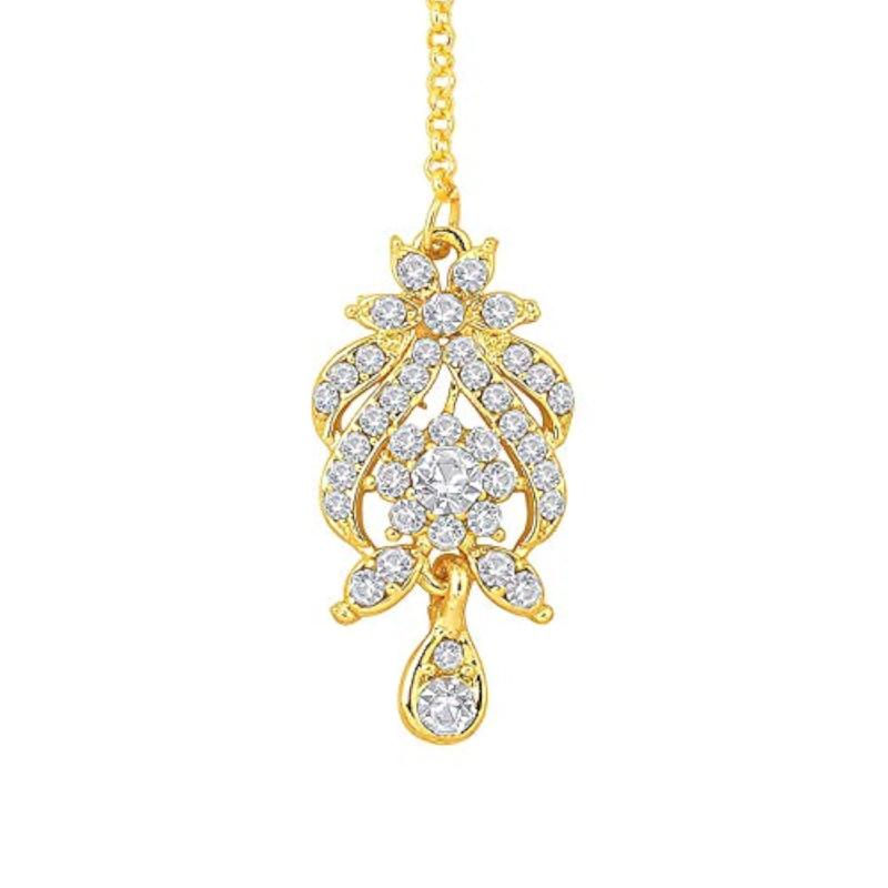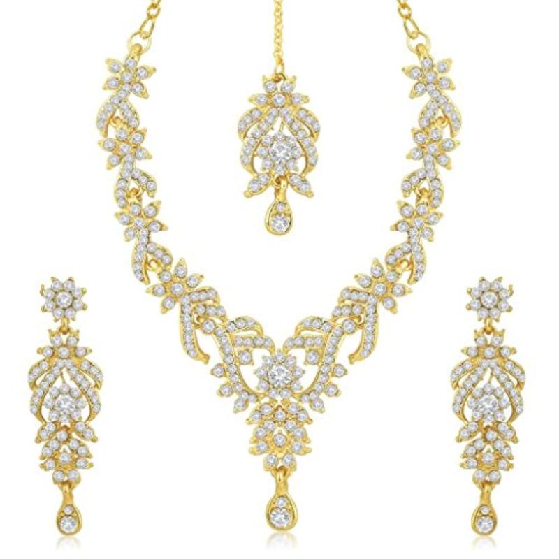 Elegant choker jewelry set featuring sparkling CZ stones. Includes earrings and maang tikka for a complete look.