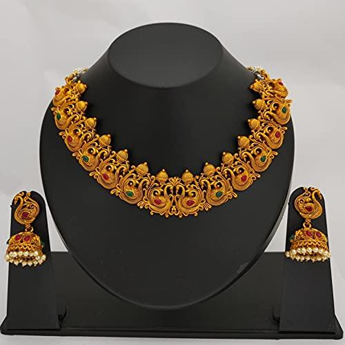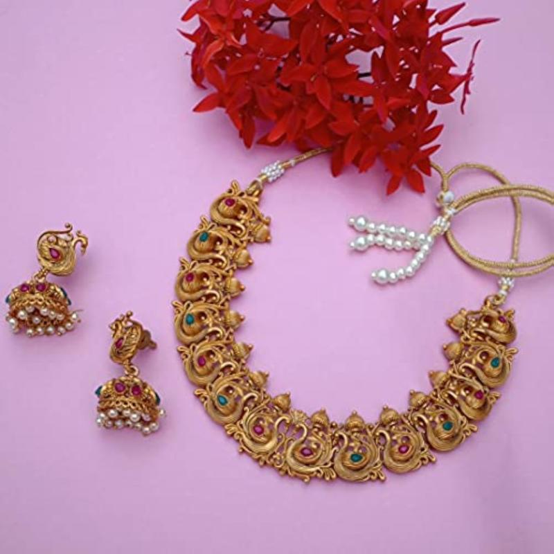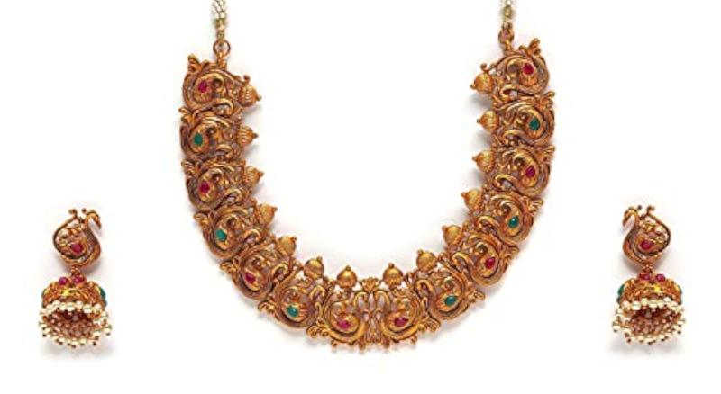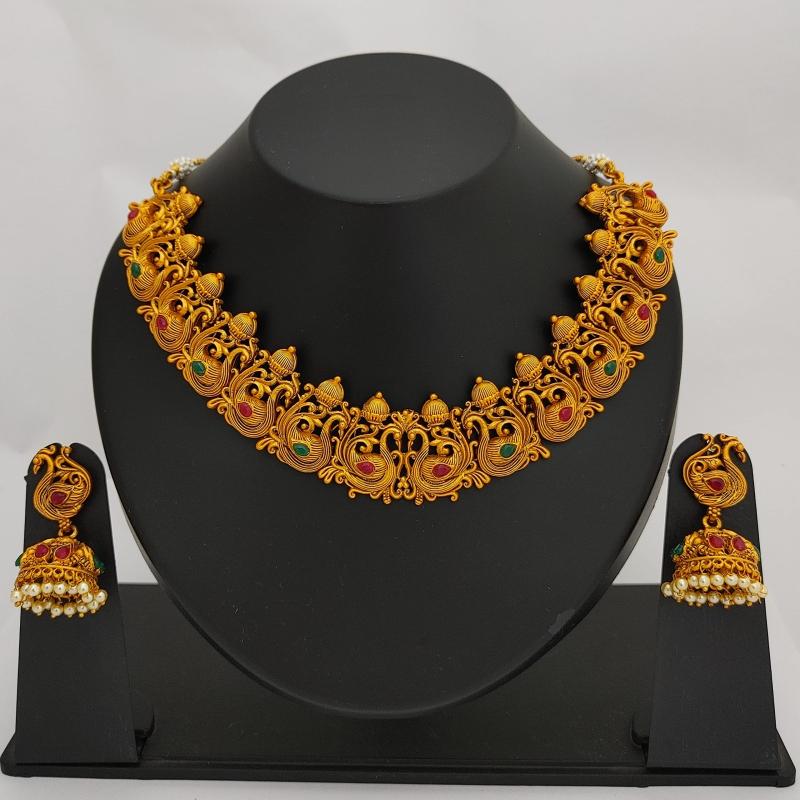 Elegant plated necklace set featuring holy swans design with colored stones and pearls.
