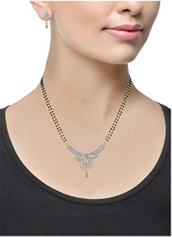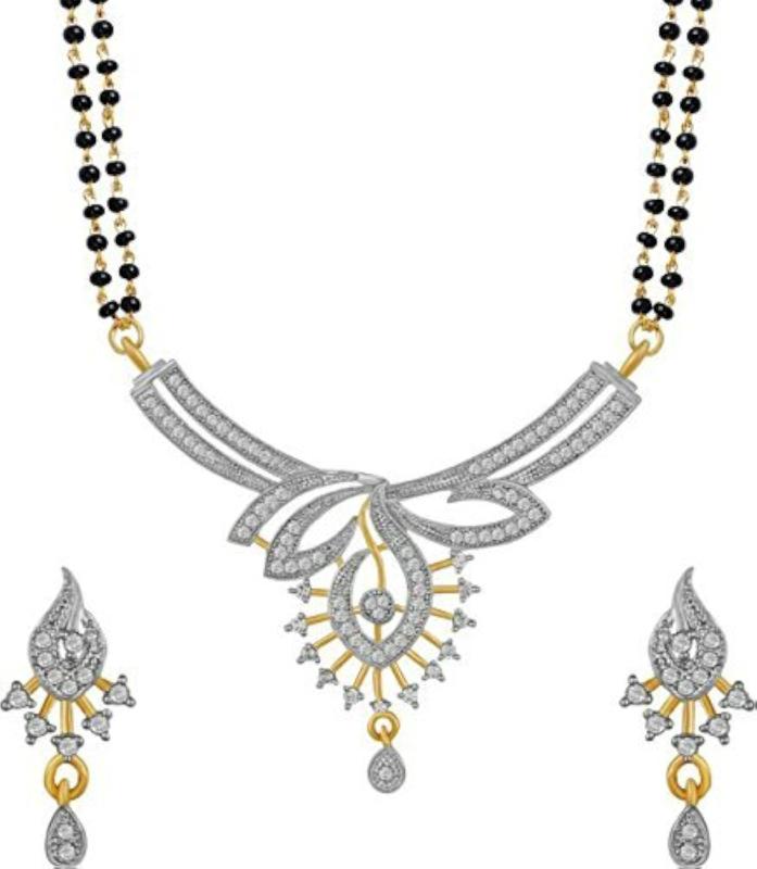 This stunning mangalsutra set features a diamond plated pendant with chain and matching earrings.