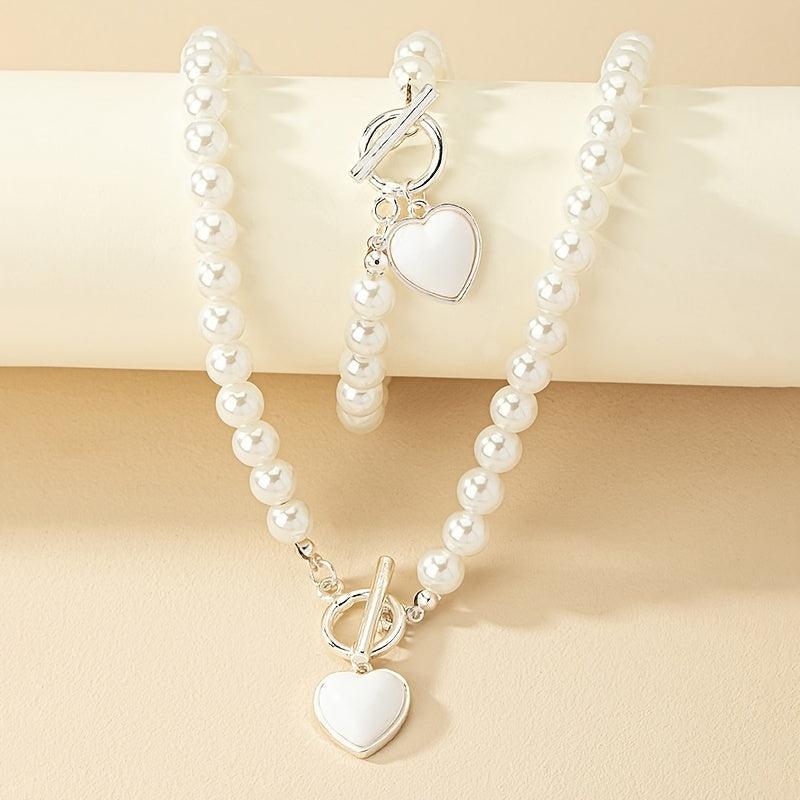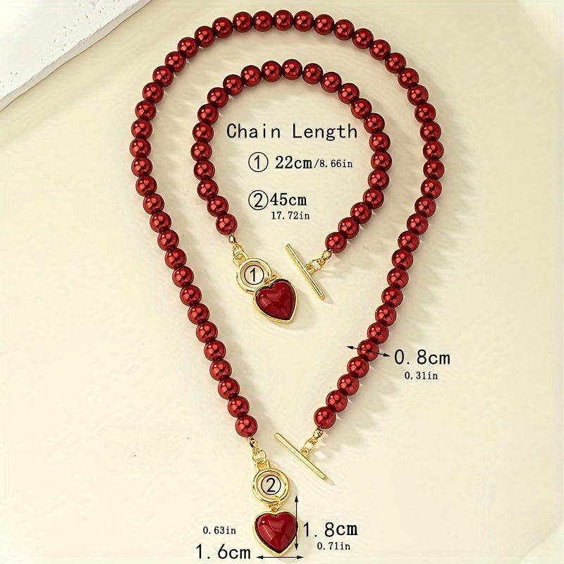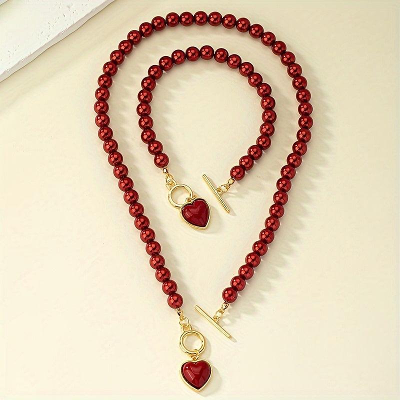 Complete your wedding attire with this elegant red and faux pearl bead necklace and bracelet set featuring a heart-shaped pendant. Perfect for weddings and special occasions.