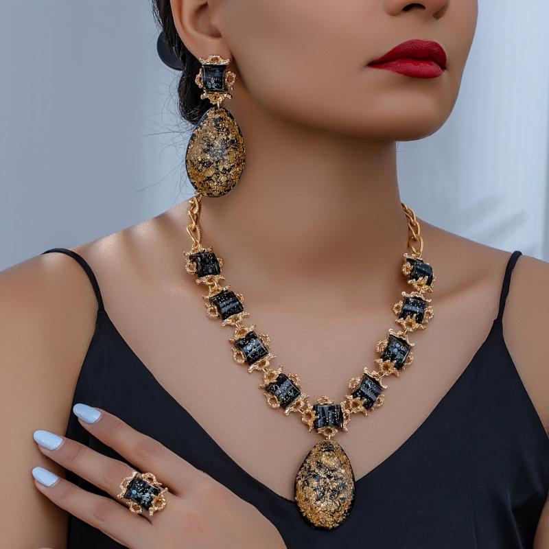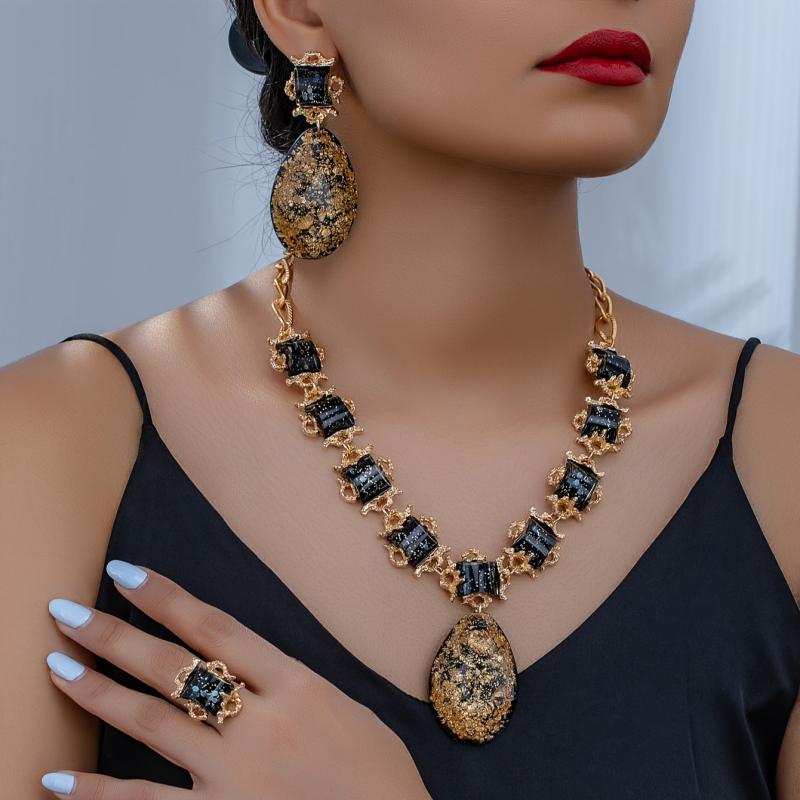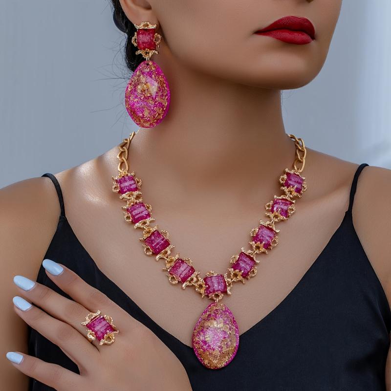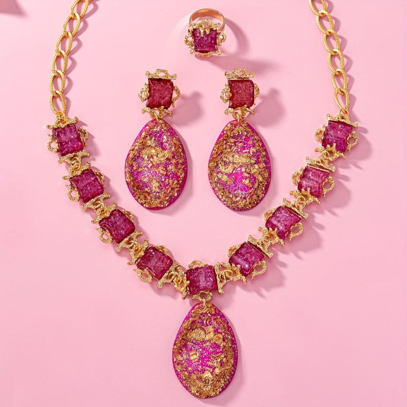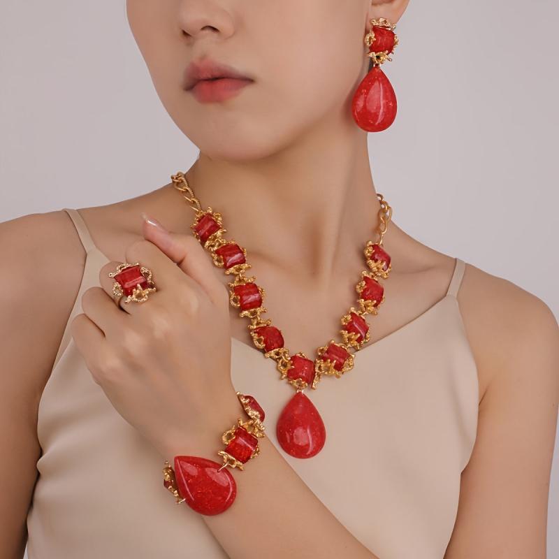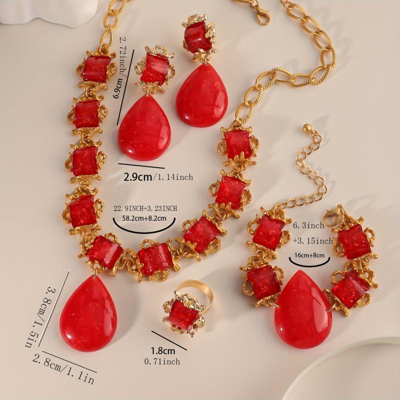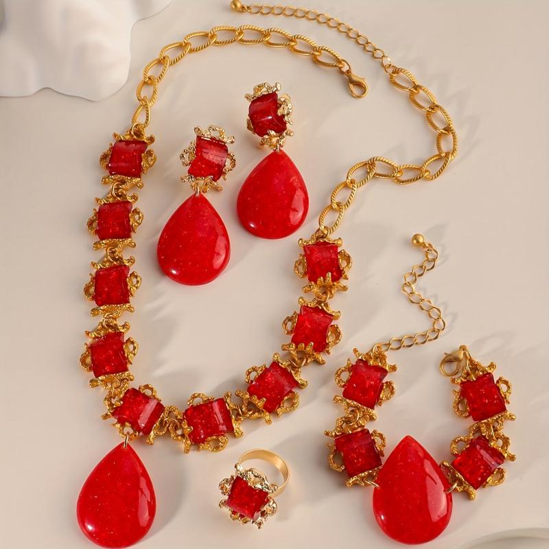 Complete your look with this stunning red synthetic gemstone necklace, earrings, bracelet, and ring set. Perfect for weddings, parties, banquets, birthdays, dates, balls, and shopping outings.
