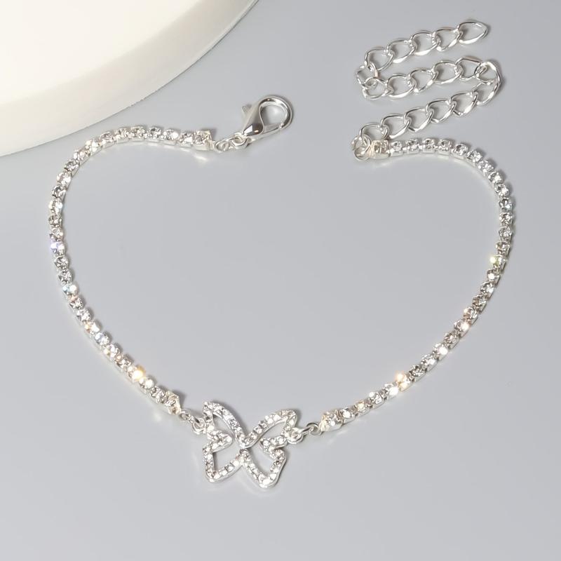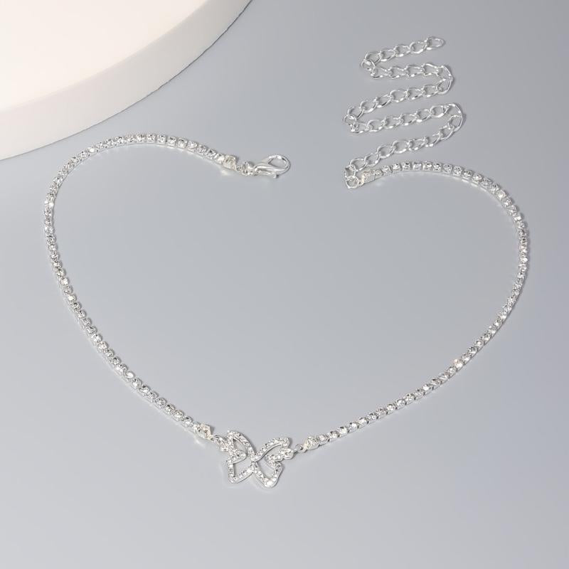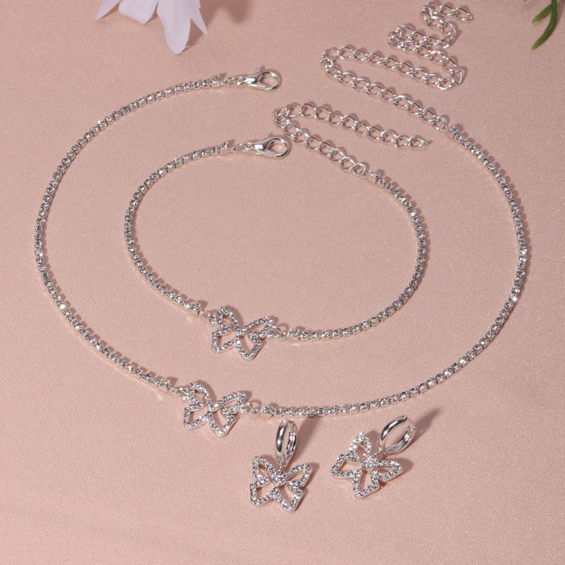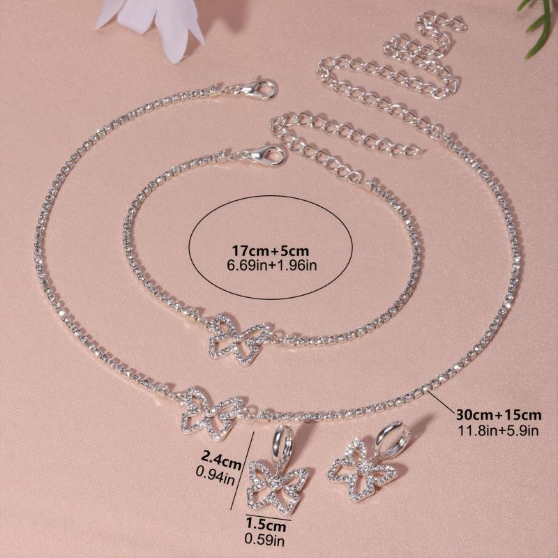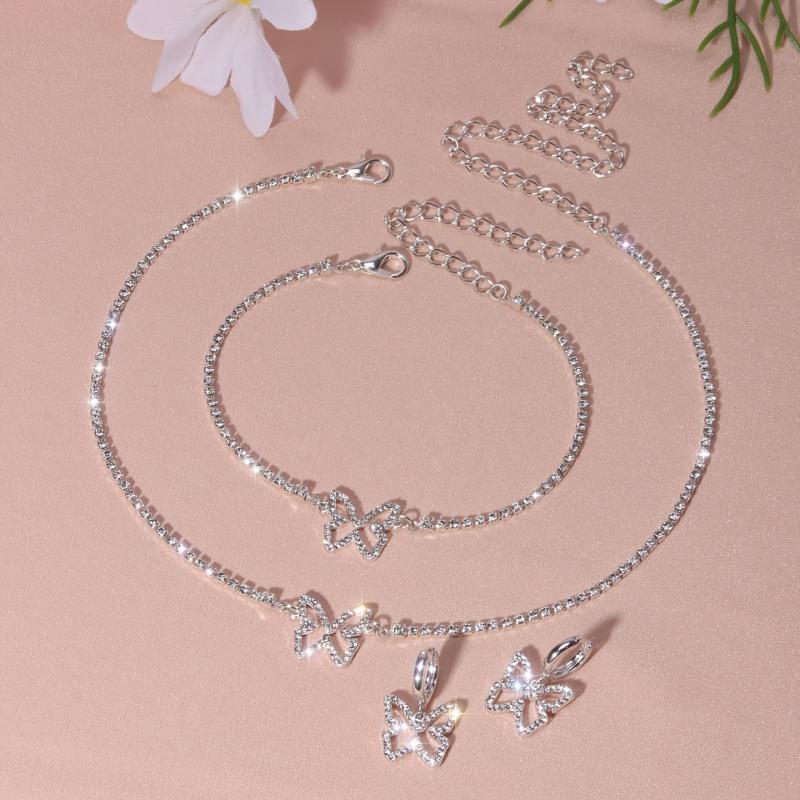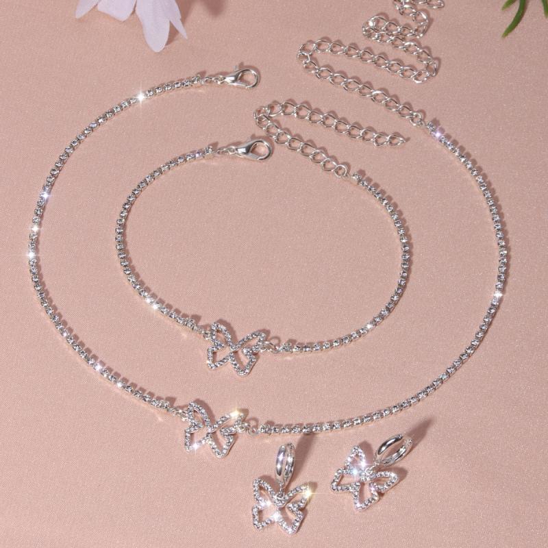 Adorn yourself with this stunning jewelry set featuring a full rhinestone butterfly design on a choker necklace, chain bracelet, and dangle earrings. Perfect for adding a touch of glamour to any outfit.
