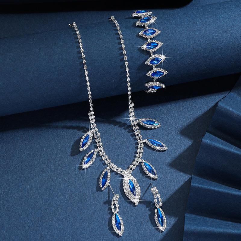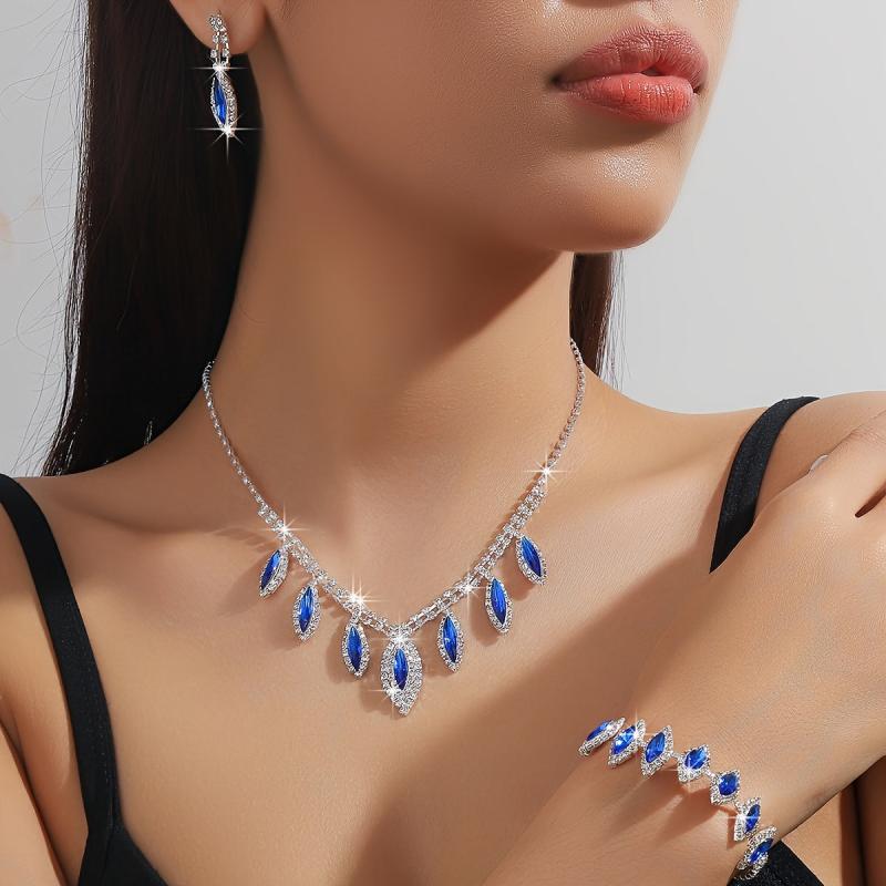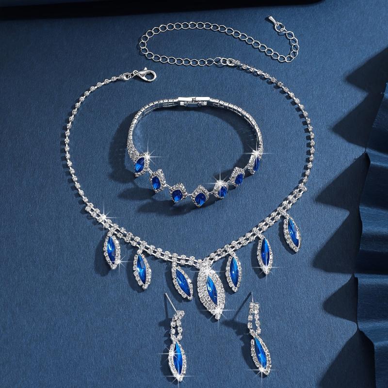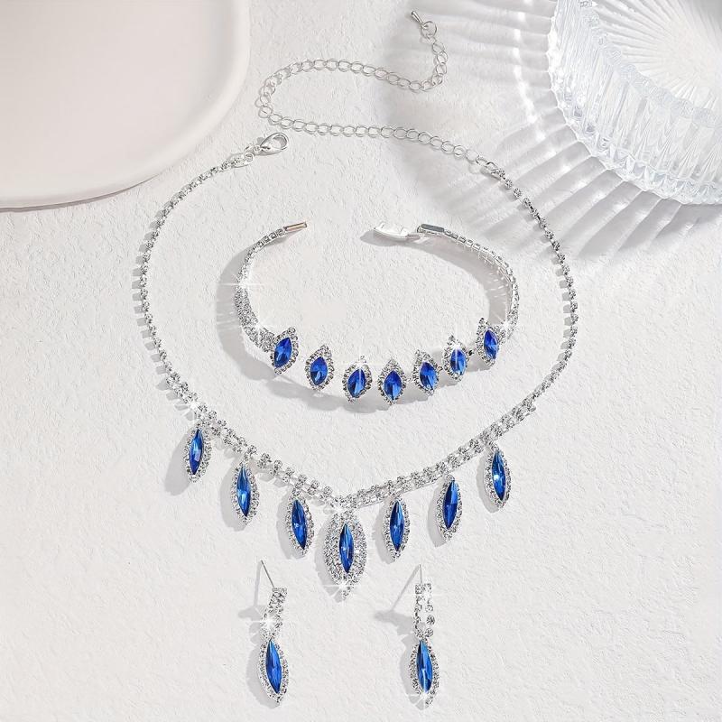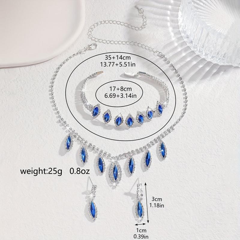 Dazzle in this three-piece set of sparkling rhinestone water drop pendant jewelry perfect for bridal wedding attire or evening parties.