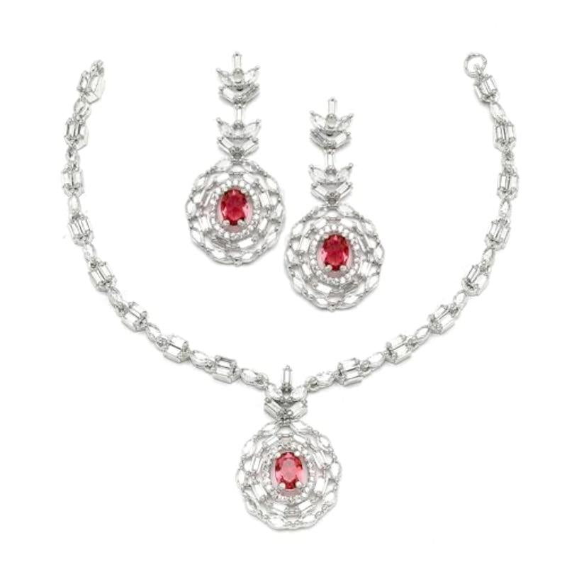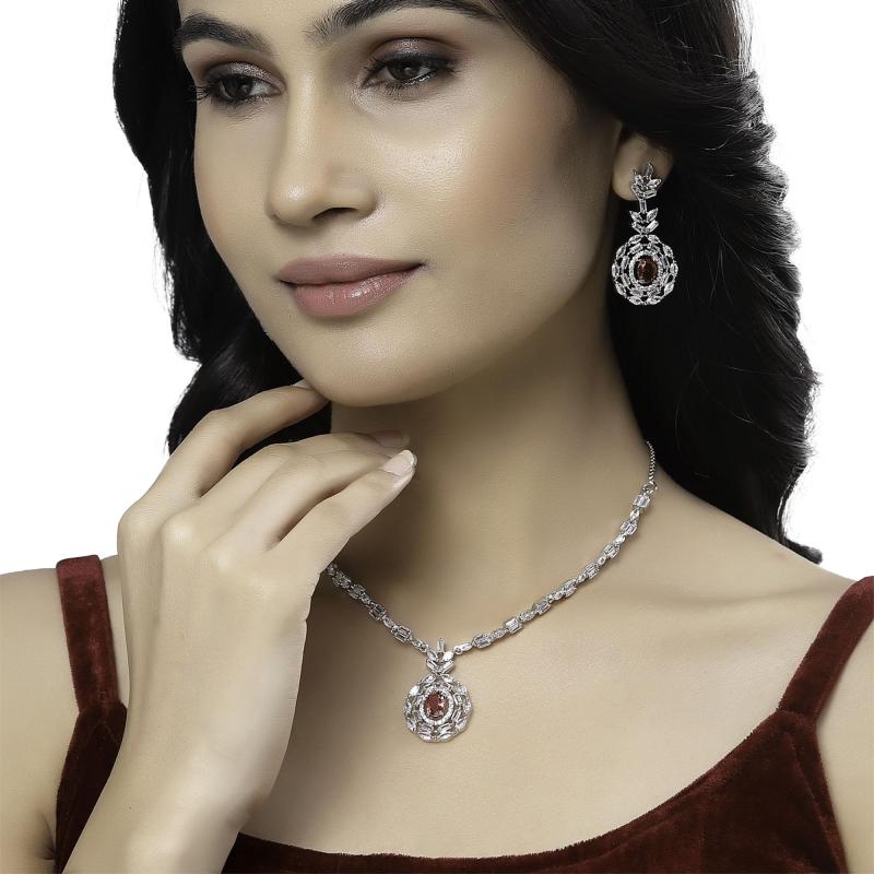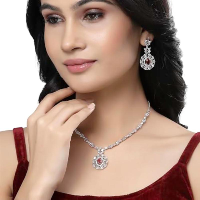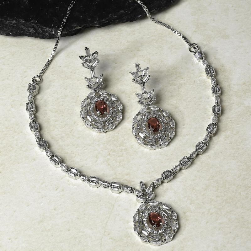 Elegant jewelry set featuring square & circular shaped American diamond studded necklace with matching earrings.