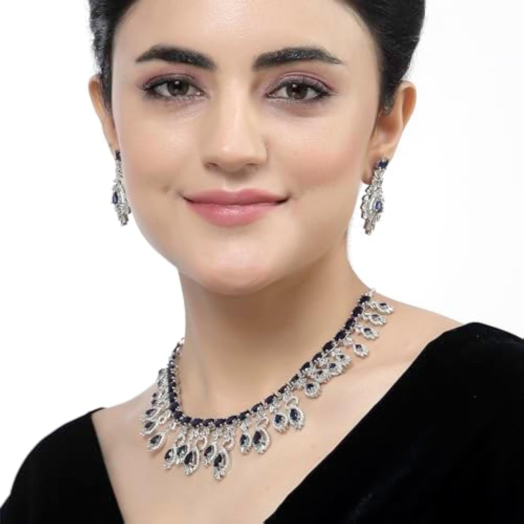 Elegant rhodium-plated necklace and earrings set with American diamond studding. Perfect for special occasions.