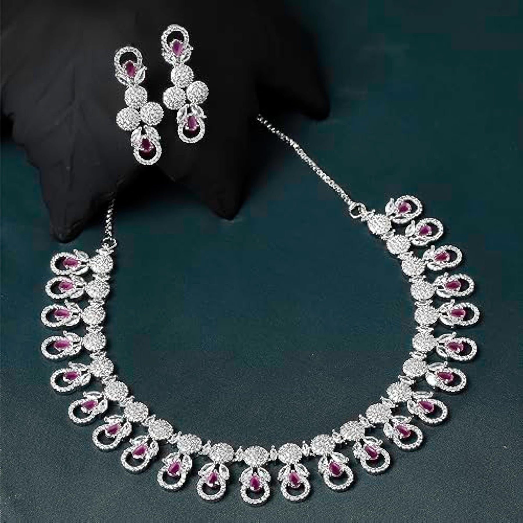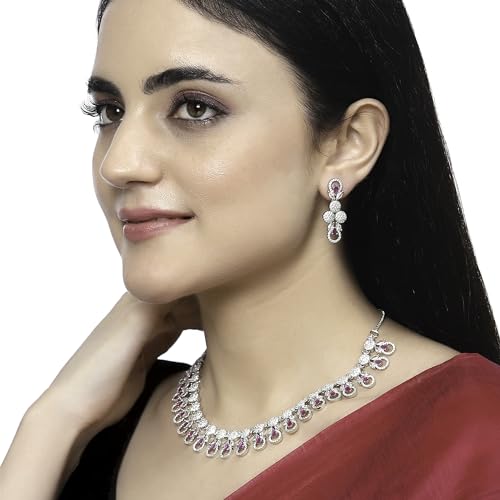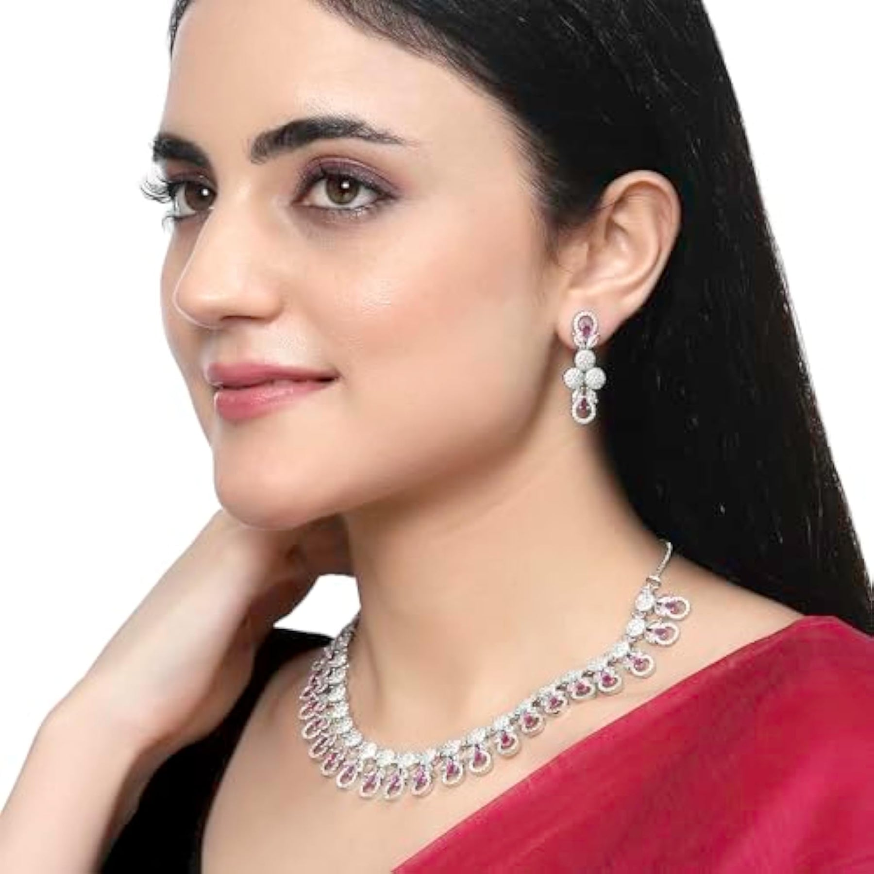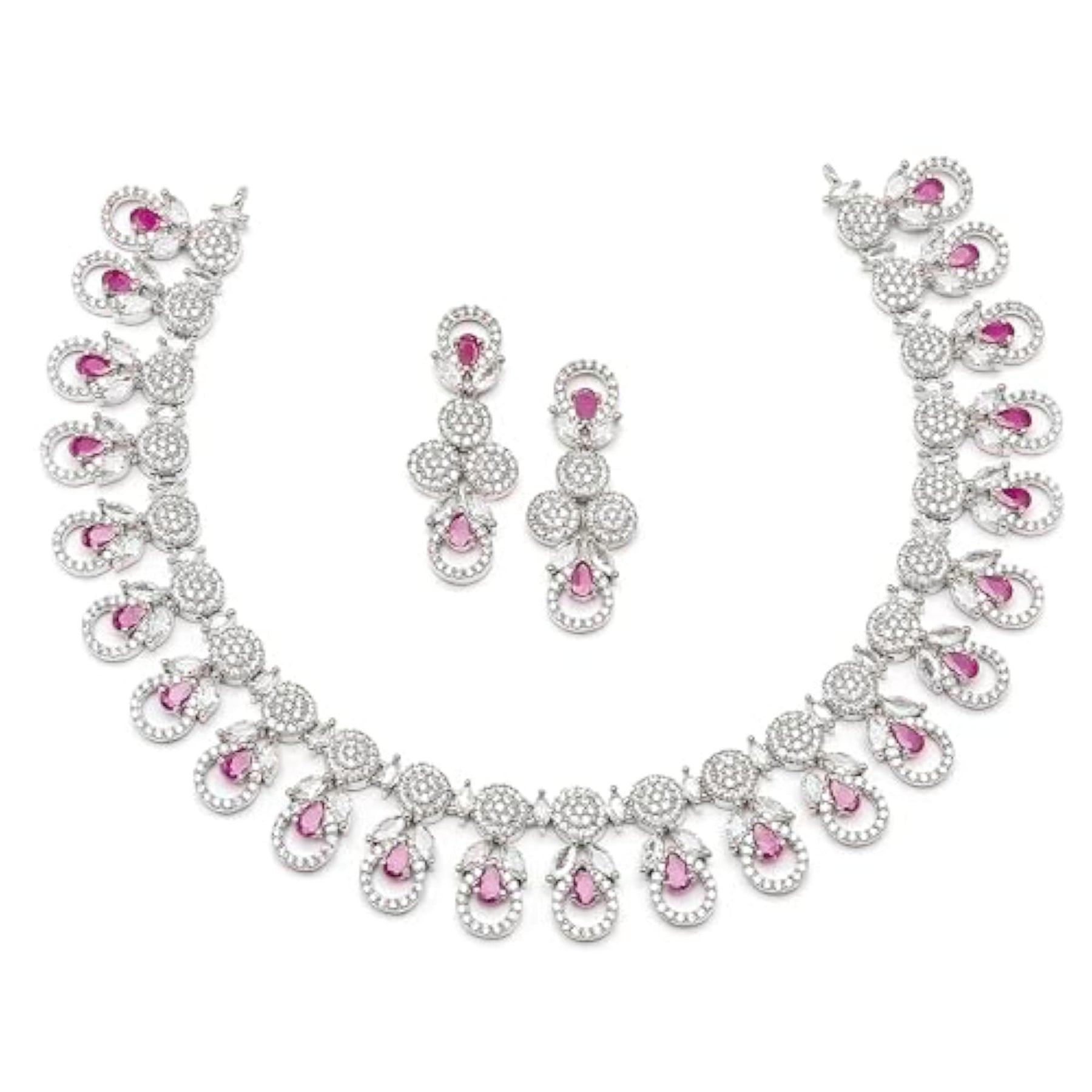 Enhance your style with this voguish necklace and earrings set featuring rhodium-plated American diamonds. Perfect for any occasion.