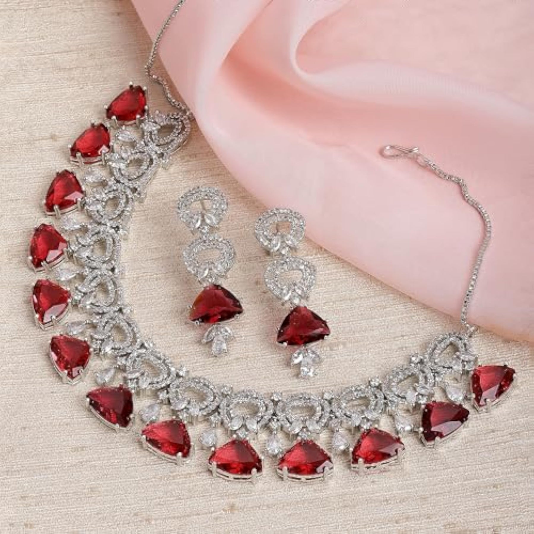 Elegant jewellery set featuring silver-toned choker necklace and drop earrings with American diamonds.