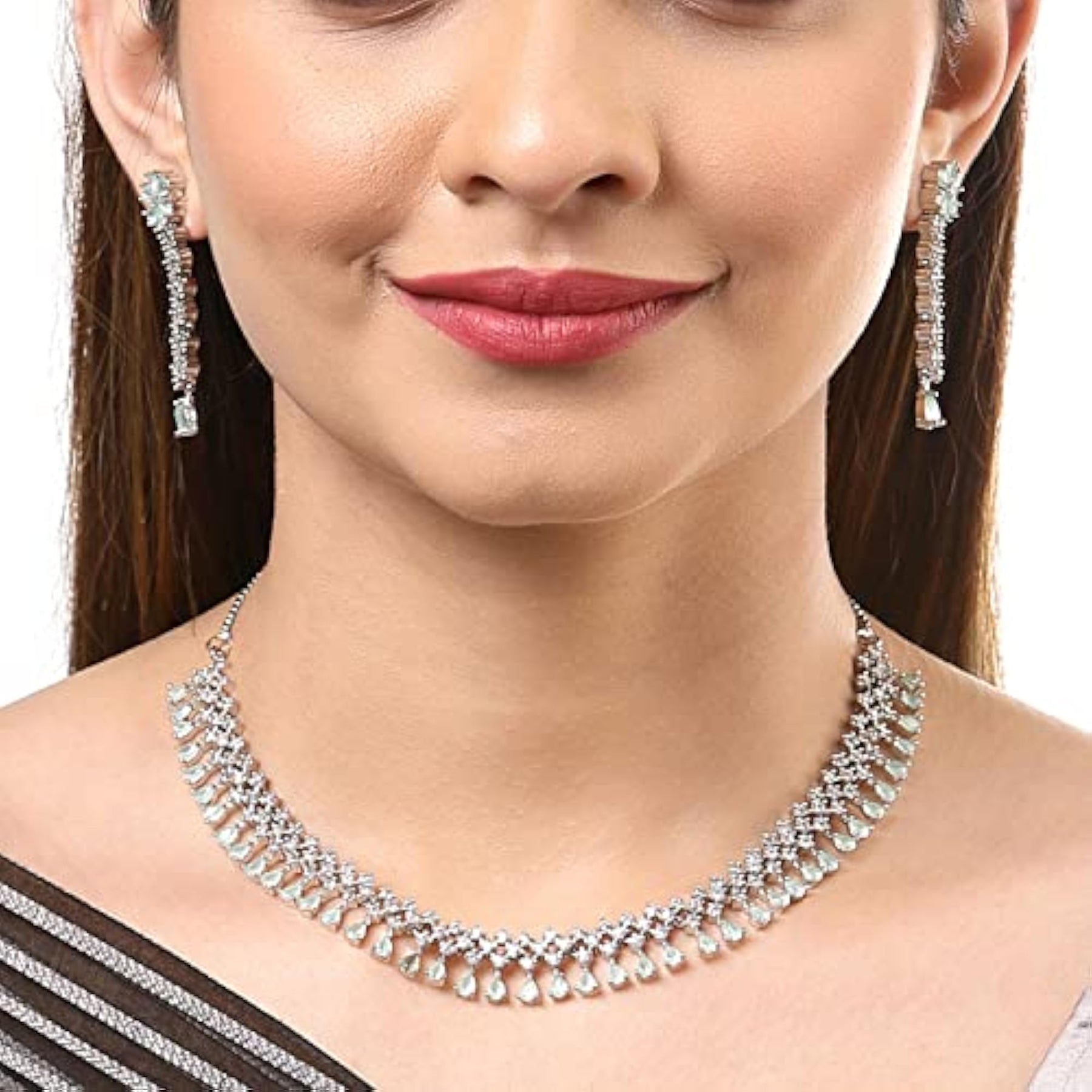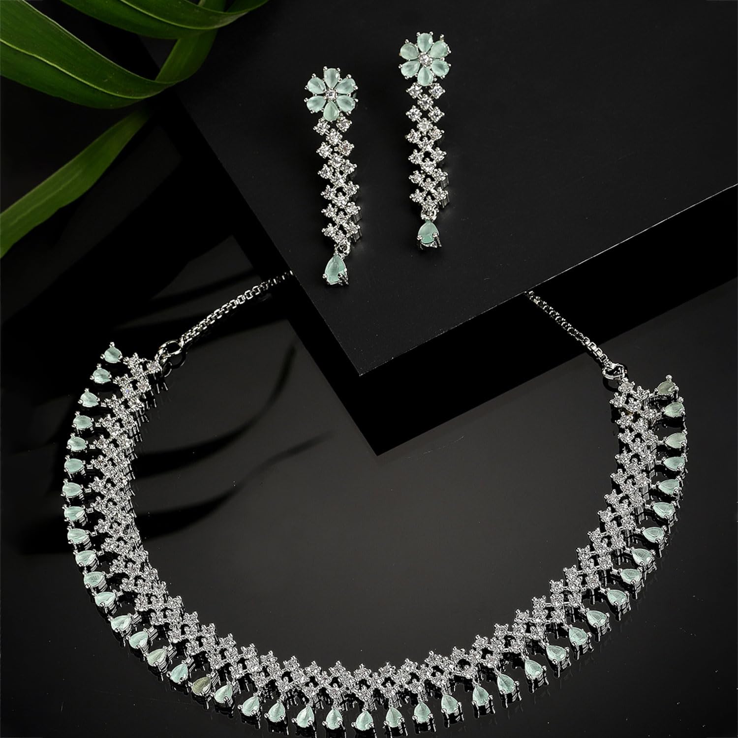 Elegant rhodium-plated necklace featuring a sea green gemstone pendant with pink ad-studded detail. The necklace is secured with a fish-hook closure for easy wear.