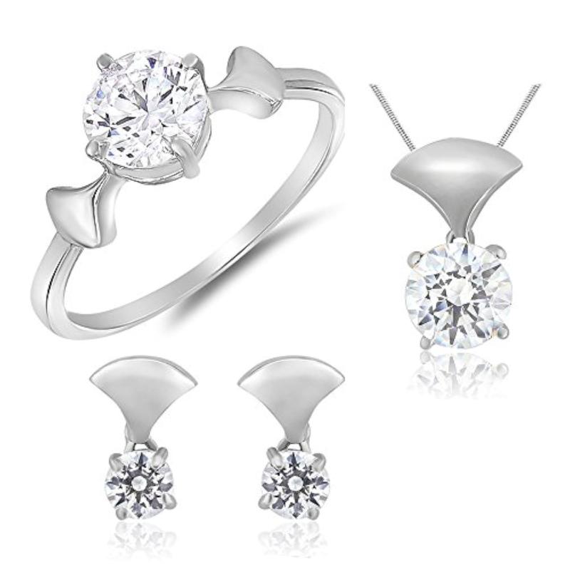 This elegant jewelry set includes a finger ring, earrings, pendant, and chain, all adorned with sparkling Swarovski Zirconia stones.
