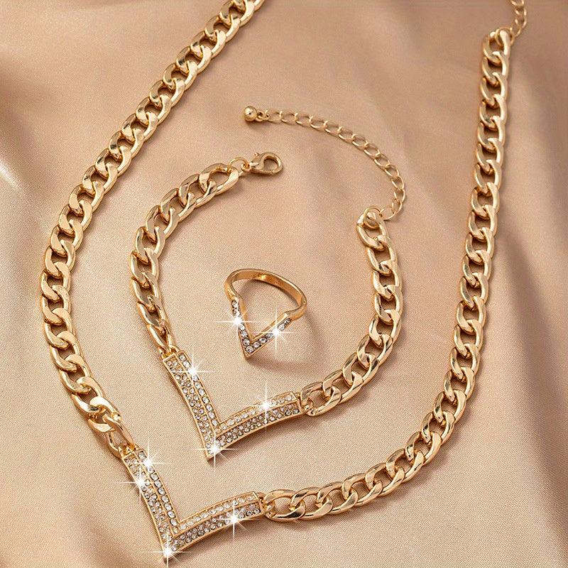 This jewelry set is the perfect accessory for style enthusiasts. It includes a ring, bracelet, and necklace featuring a V chain design that complements both daily wear and party outfits.