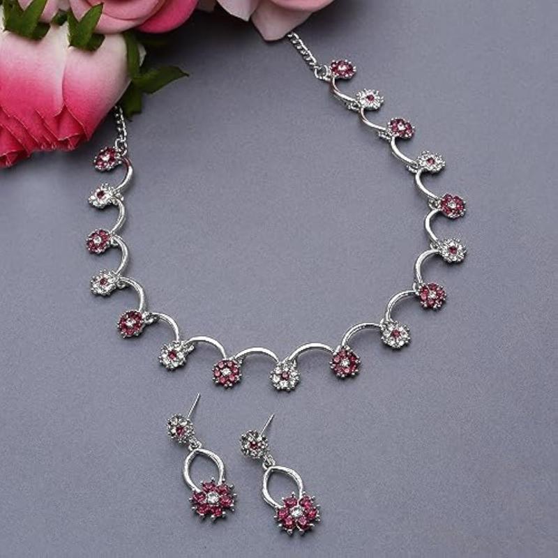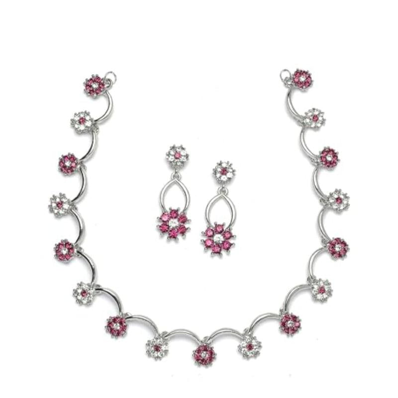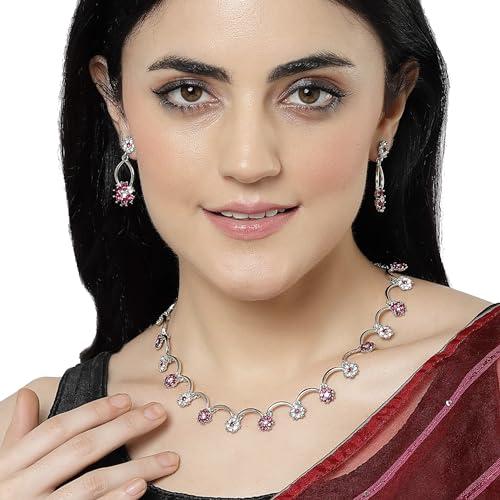 Elegant rose gold-plated necklace with American Diamond studded star design. Includes matching earrings for a complete set.