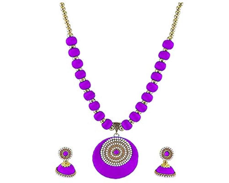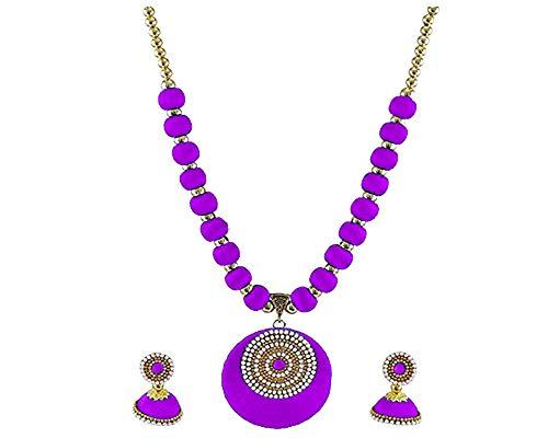 Elegant set featuring a round pendant necklace and matching earrings. Crafted from silk for a luxurious look.