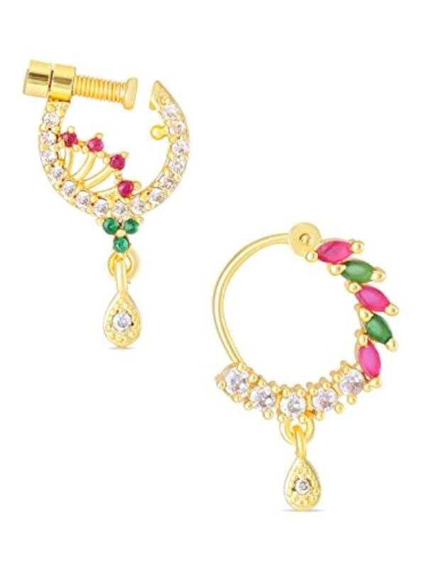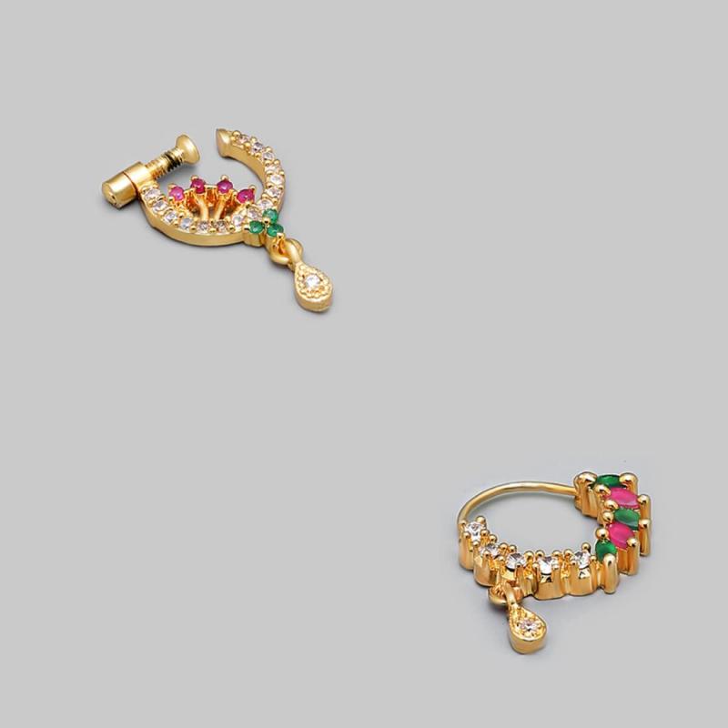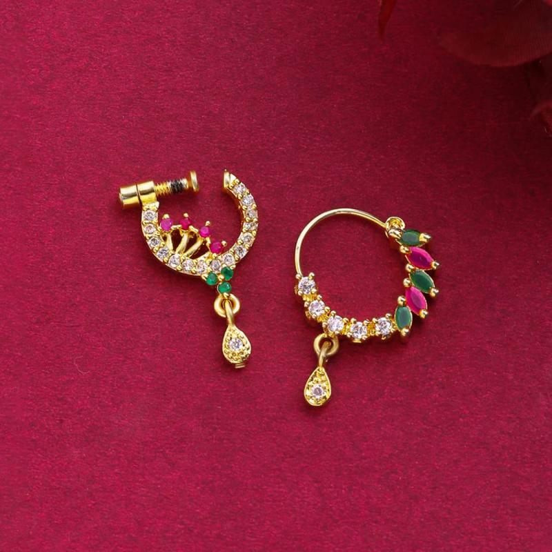 Enhance your style with this set of 2 nose rings featuring a plated and pink American diamond design. Perfect for adding a touch of elegance to your look.
