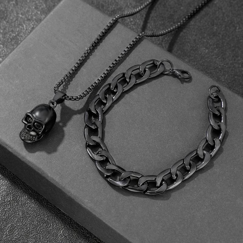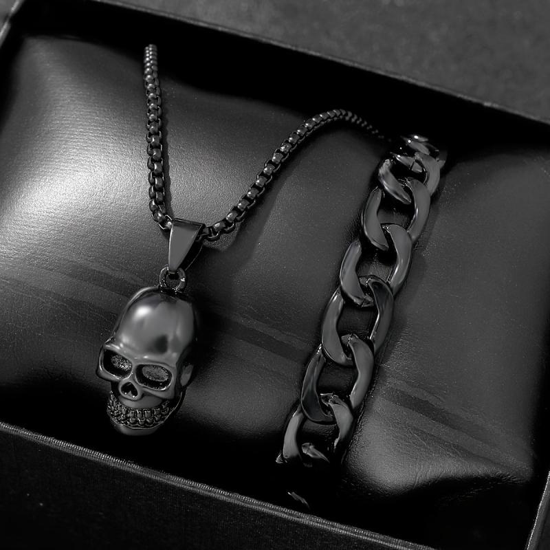 Get a bold street style look with this men's jewelry set featuring a skull pendant necklace and bracelet. Perfect gift for men who love unique accessories.