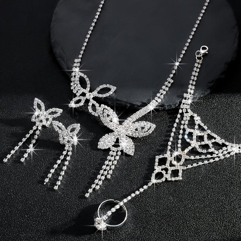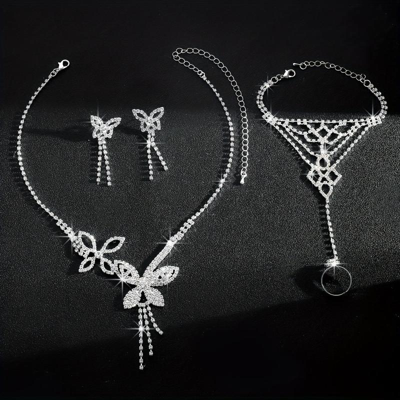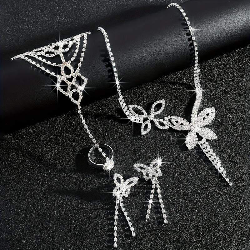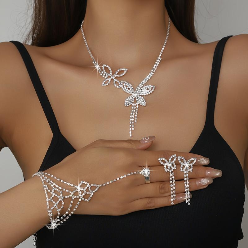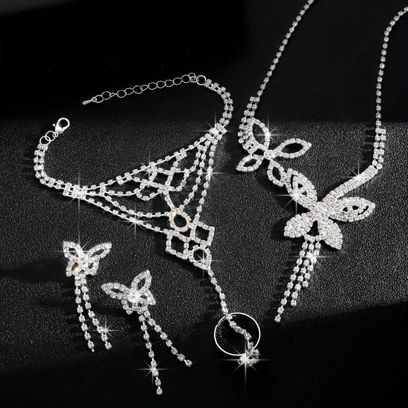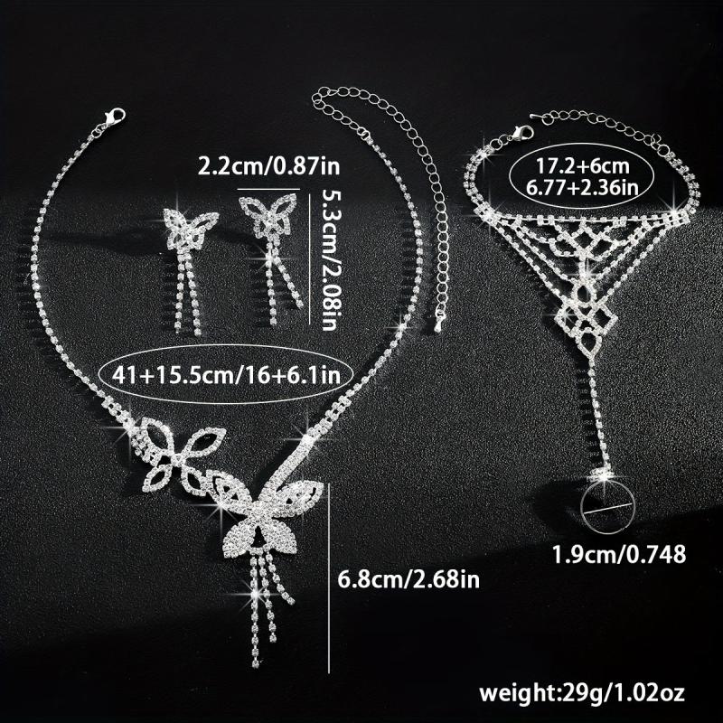 Elevate your wedding look with this stunning rhinestone butterfly necklace, bracelet, and ring set. Perfect for formal events and weddings, this set features intricate butterfly motifs with dazzling rhinestones.
