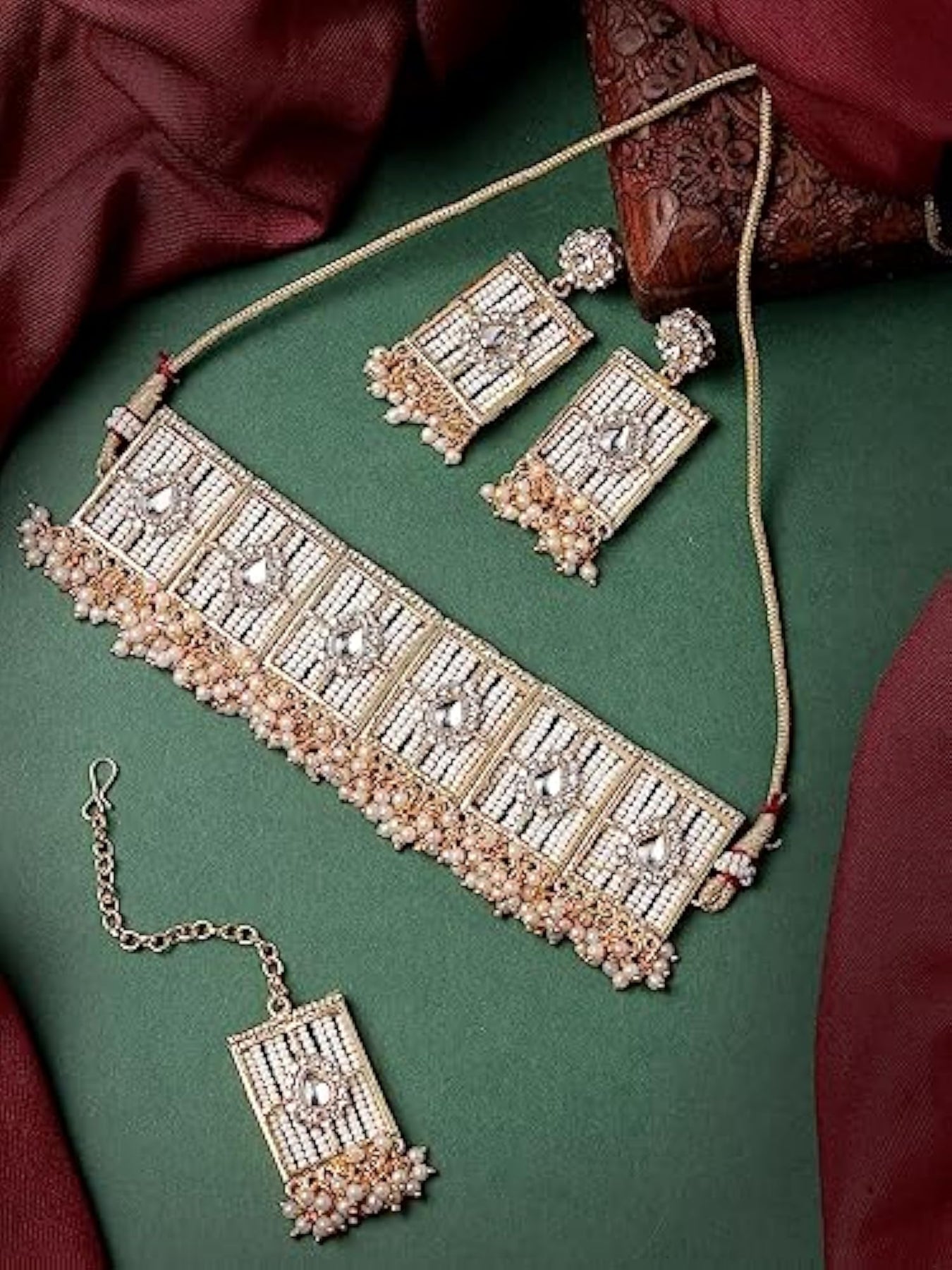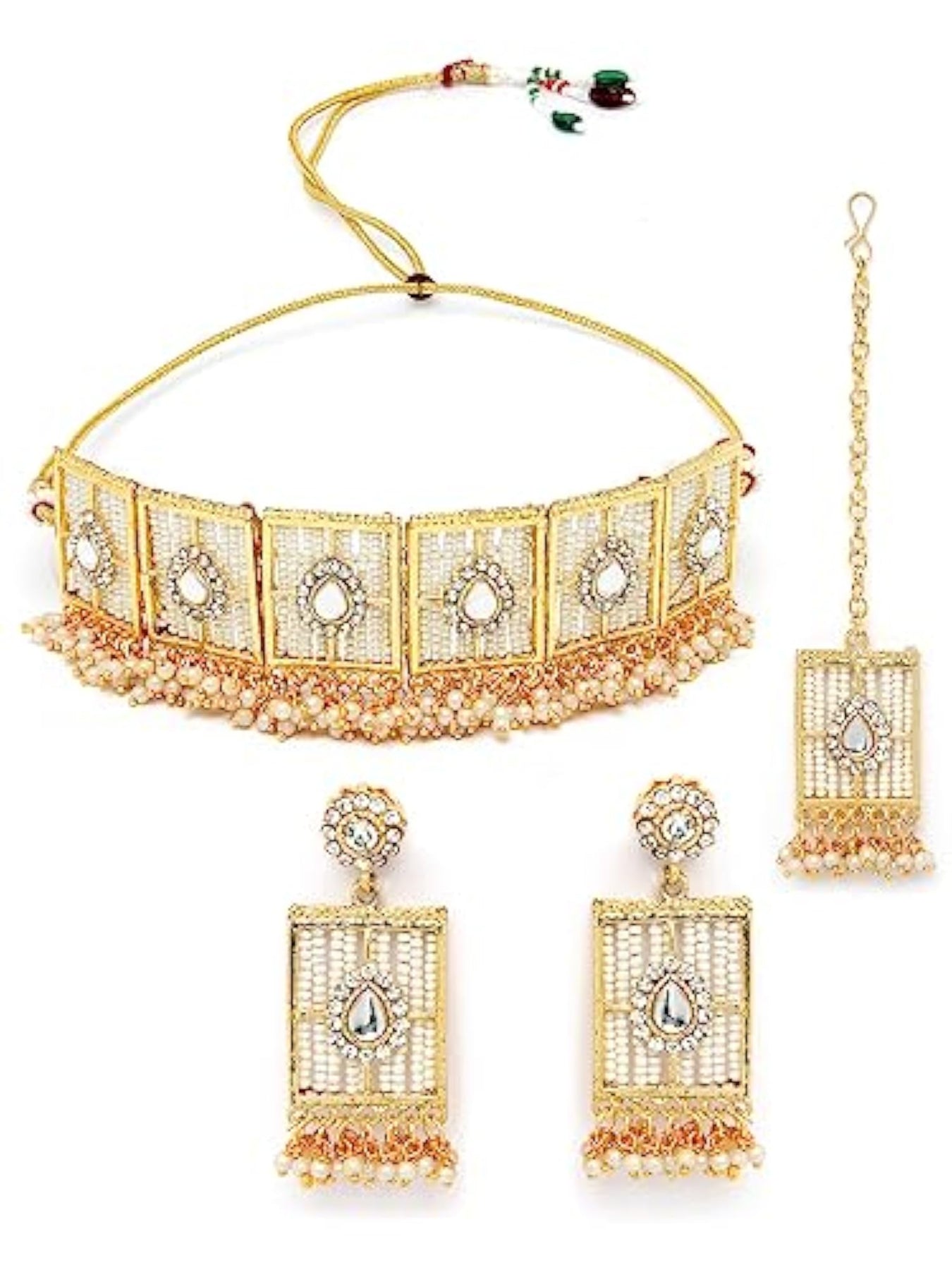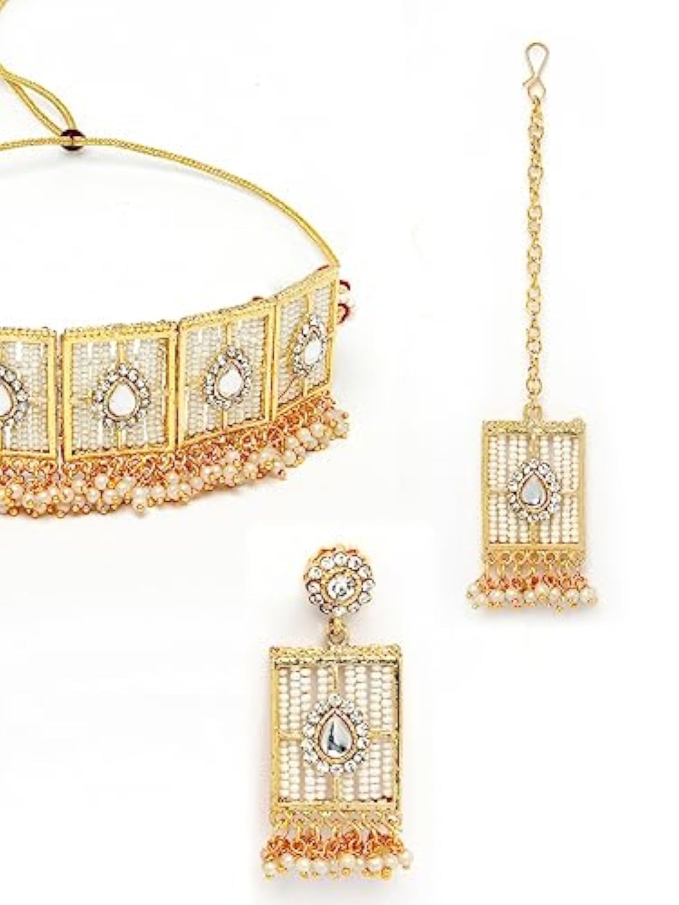 Elegant squared shaped beads plated choker necklace set with matching earring and maangtika. Perfect for special occasions.