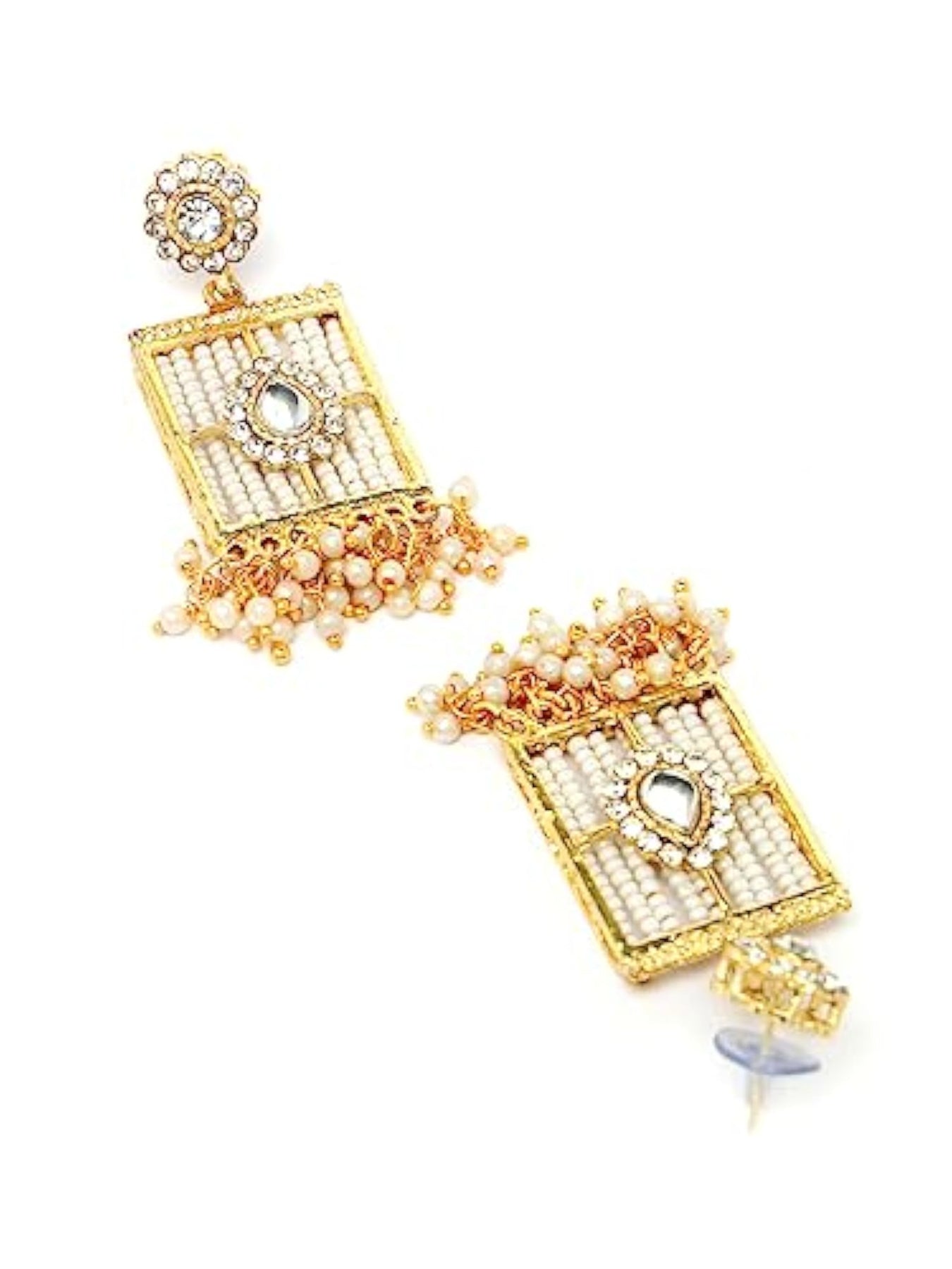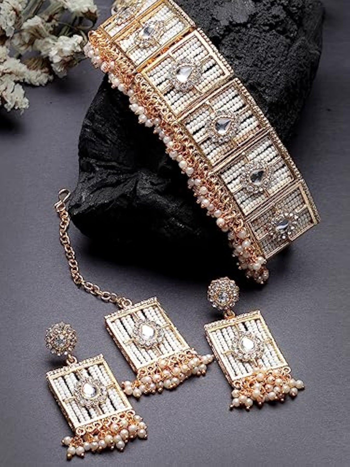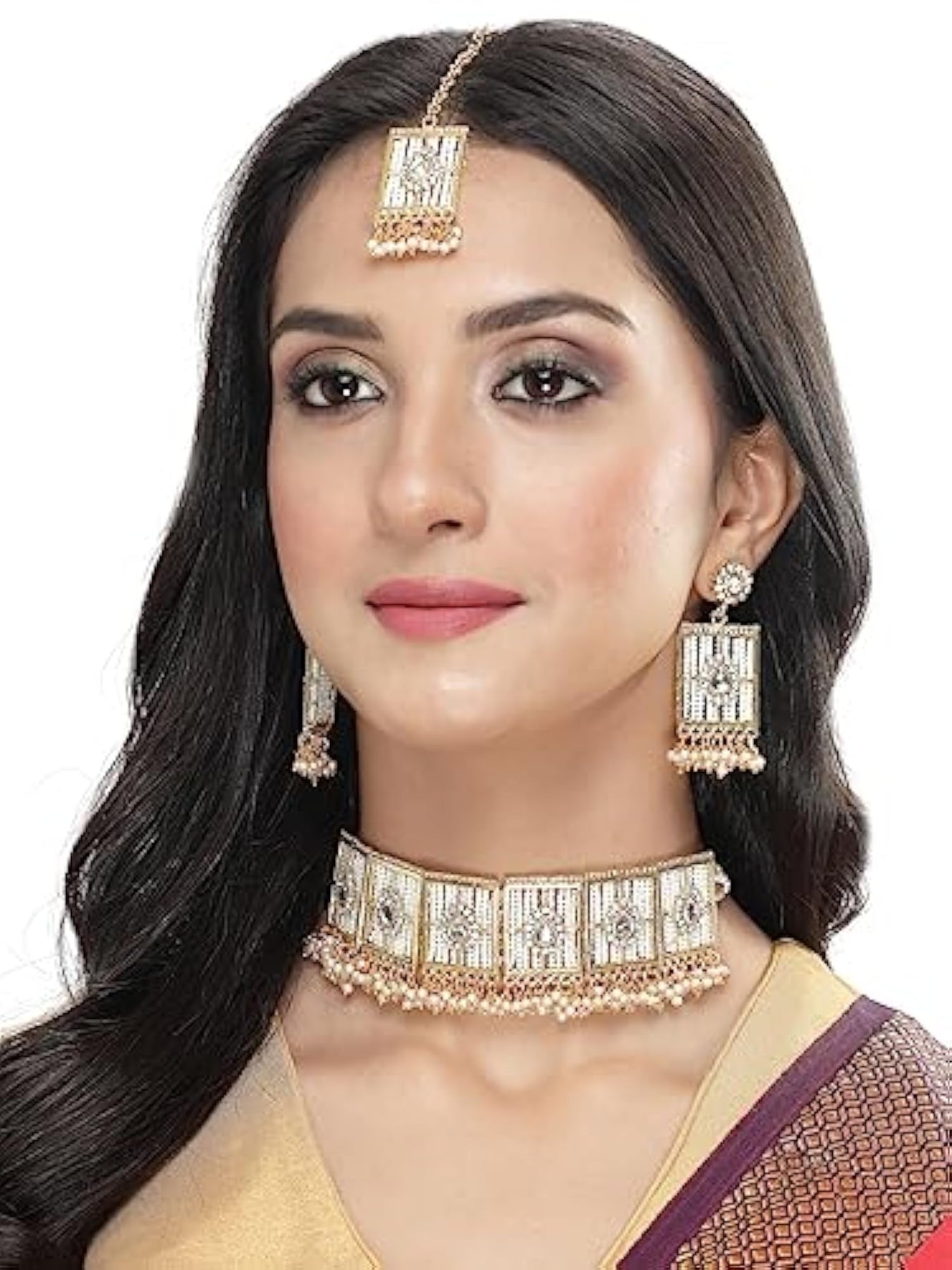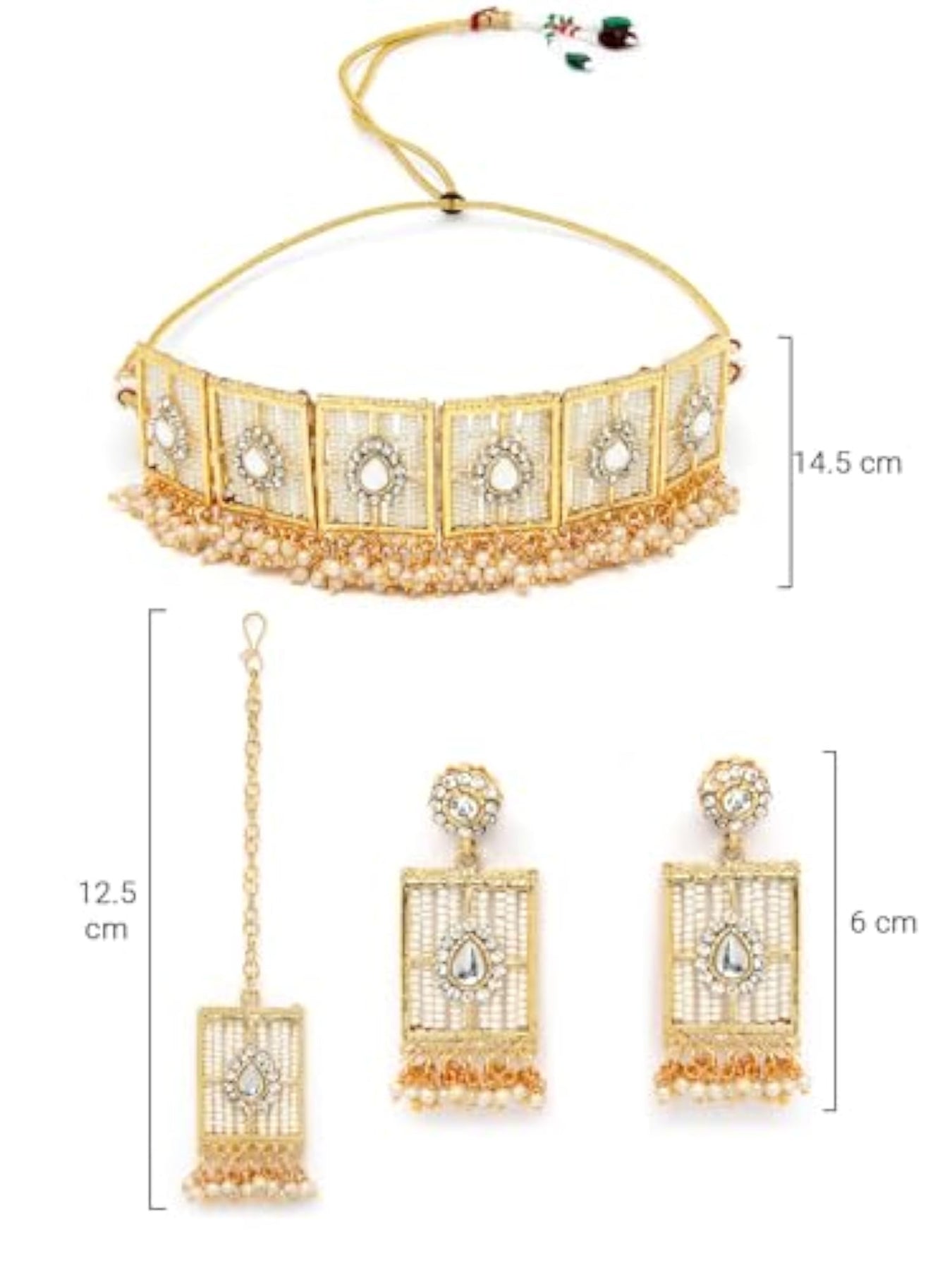 Elegant squared shaped beads plated choker necklace set with matching earring and maangtika. Perfect for special occasions.