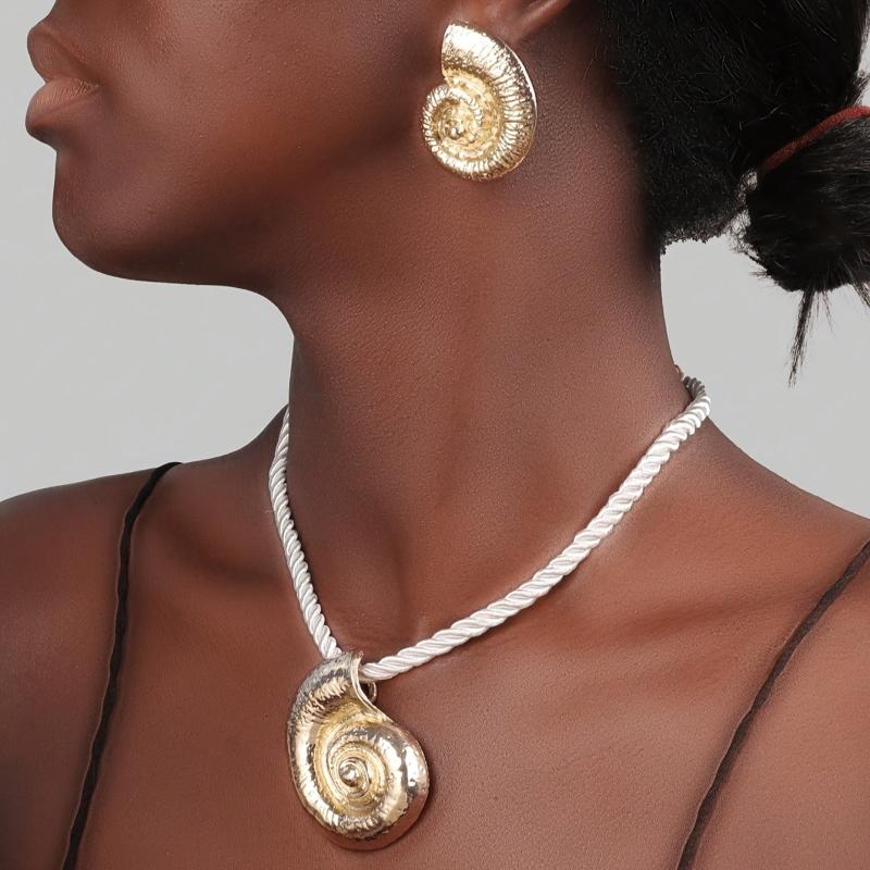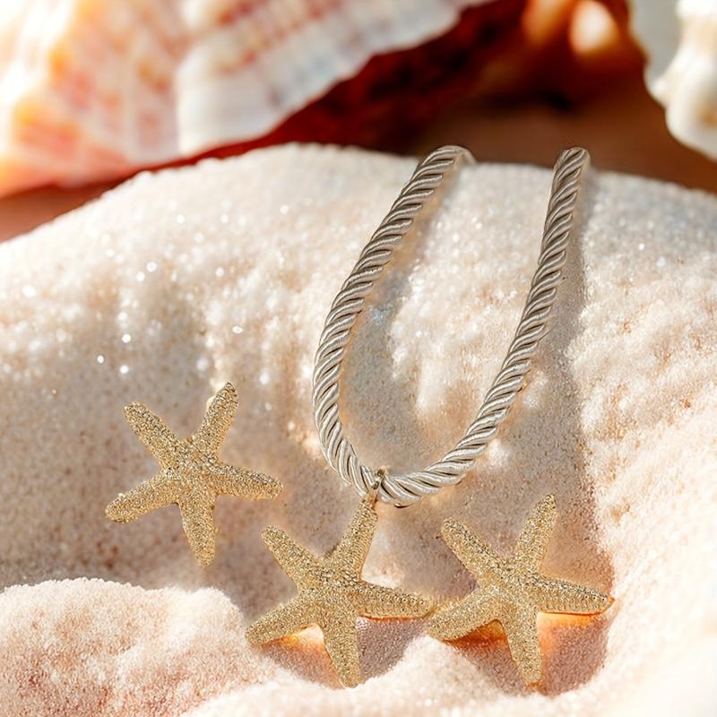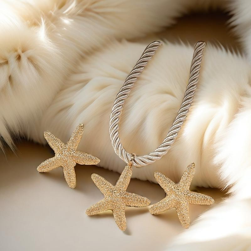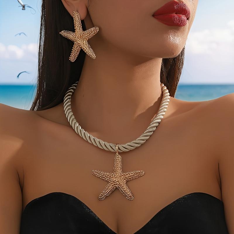 This set includes an elegant starfish pendant necklace and a pair of marine-themed exaggerated earrings for ladies.