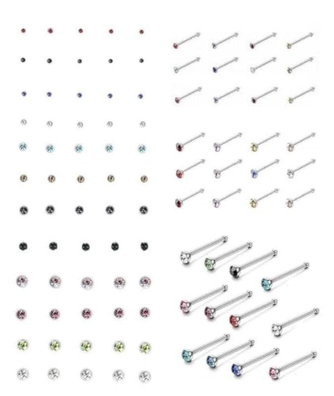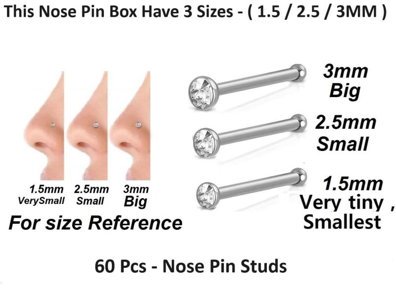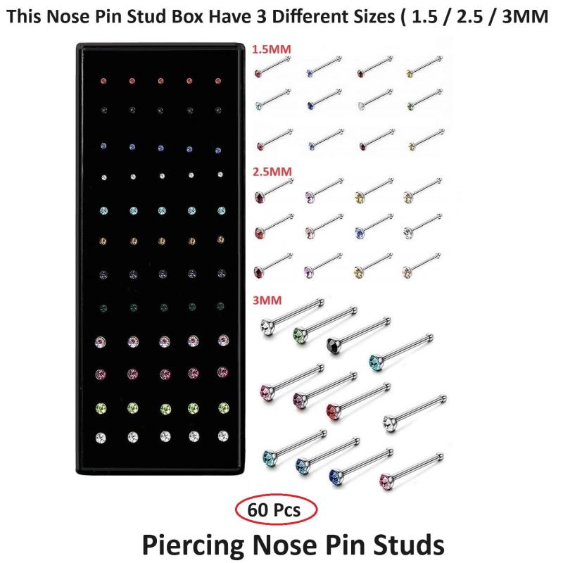Enhance your style with this set of sterling silver nose studs and hoop ring. Includes 60 pieces in 1.5mm, 2.5mm, and 3mm sizes.