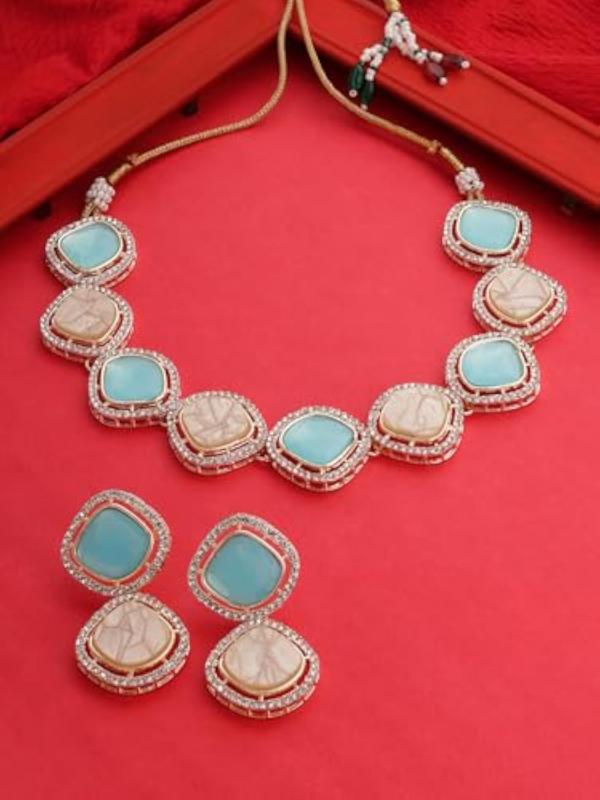 Elegant and stylish choker necklace and earring set with intricate stone embellishments.