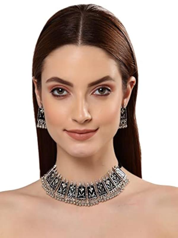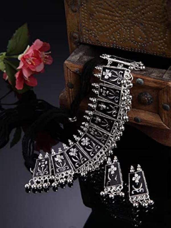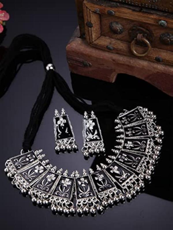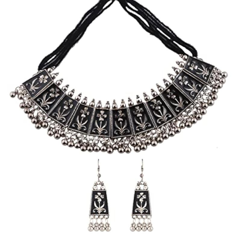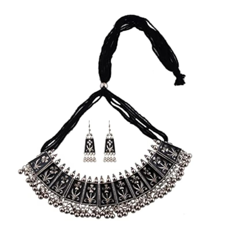 Add a touch of bohemian elegance with this oxidised necklace set. Perfect for a trendy look.