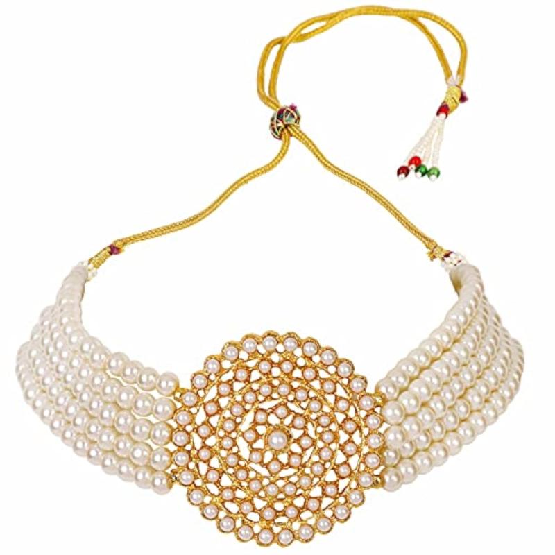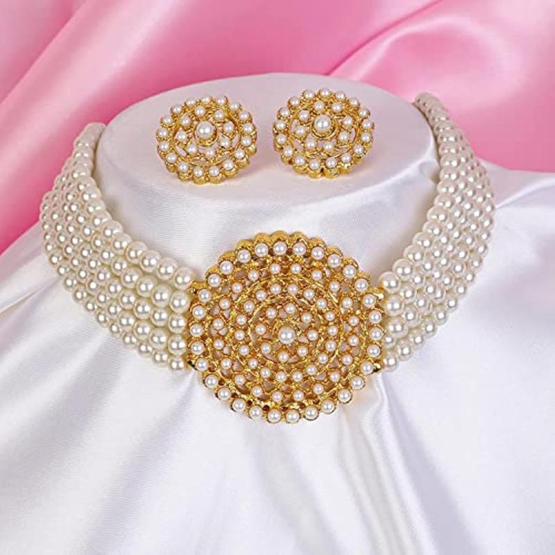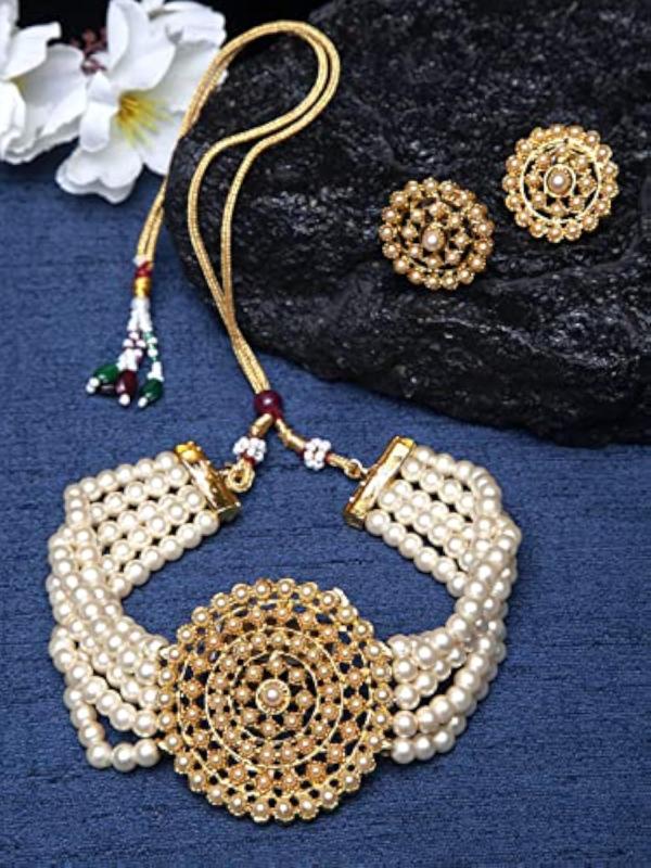 Elevate your look with this traditional choker necklace set featuring fancy pearls. Perfect for special occasions.