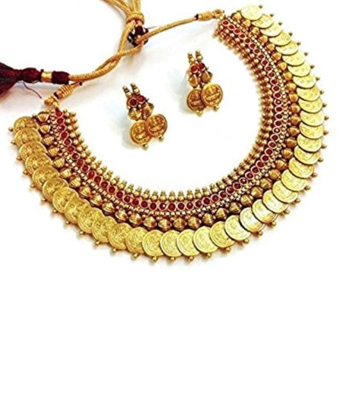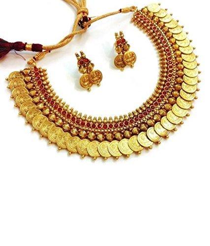 Adorn yourself with this elegant temple coin necklace and matching earrings set. Perfect for any occasion.